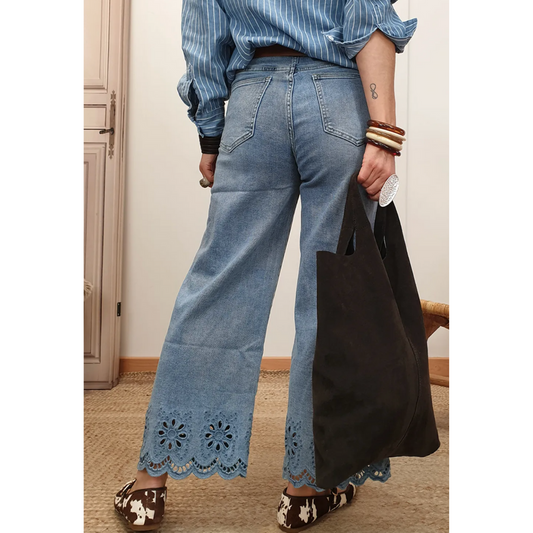 Who Holds The Key, Dusk Blue Embroidered Cropped Wide Leg High Waist Jeans