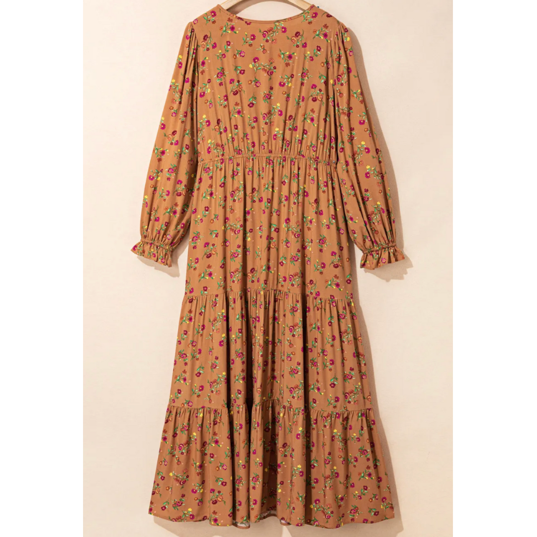 Step into fall with effortless charm in the Autumn Bloom Maxi Dress. Designed with a warm caramel base and scattered with petite pink and green floral prints, this dress is a celebration of cozy elegance. Its flowy tiered silhouette and soft long sleeves make it perfect for crisp autumn outings, pumpkin patch strolls, or a cozy brunch with friends. Pair it with boots and a crossbody for a chic seasonal look.