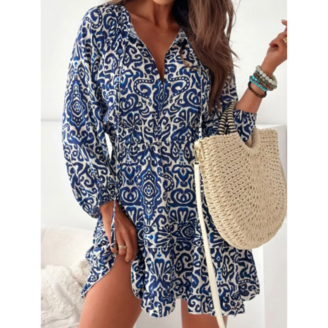 Breezy, bold, and effortlessly chic—the Azure Mirage Mini Dress is your go-to for sun-drenched days and moonlit evenings. Its striking blue-and-white abstract pattern channels coastal vibes, while the cinched waist and tiered hem create a flattering, feminine silhouette. Lightweight and flowy with long sleeves for a touch of coverage, this dress pairs perfectly with a straw bag and sandals for the ultimate seaside look.