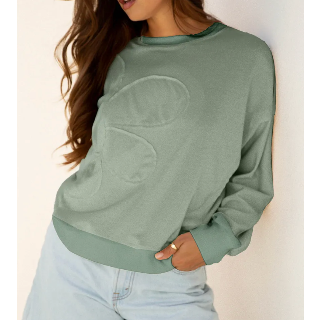 The Bloom Ease Pullover blends cozy comfort with playful charm. Featuring an oversized embossed floral design across the front, this pullover makes everyday dressing effortlessly stylish. With its relaxed fit, soft-touch fabric, and ribbed neckline, cuffs, and hem, it’s perfect for layering or wearing solo. Dress it up with chic denim or keep it casual with joggers—this pullover adds a fresh touch to any outfit. Available in soothing sage green and soft blush beige.