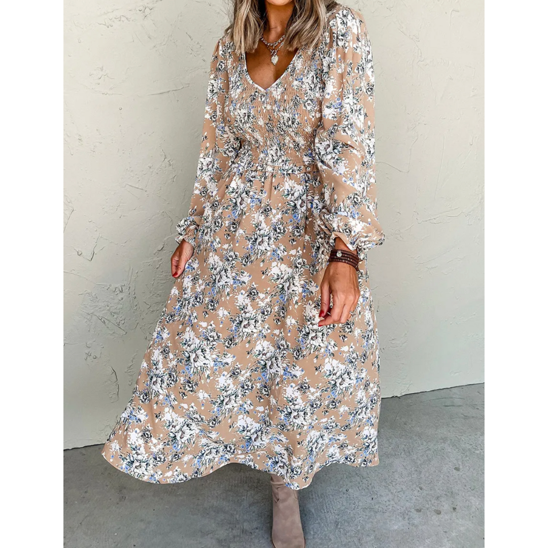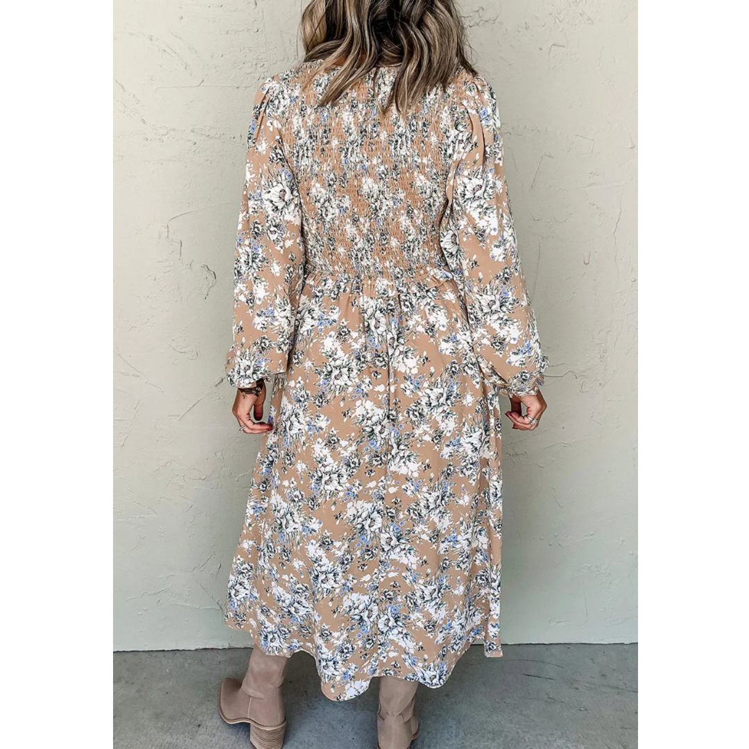 Step into effortless elegance with the Blossom Breeze Midi Dress. Designed in a soft tan base adorned with delicate white and blue floral prints, this dress exudes timeless charm. The smocked bodice provides a flattering, comfortable fit, while the flowy A-line skirt adds graceful movement. Featuring long bishop sleeves with gathered cuffs, it balances comfort and sophistication—perfect for brunch dates, garden parties, or everyday wear.