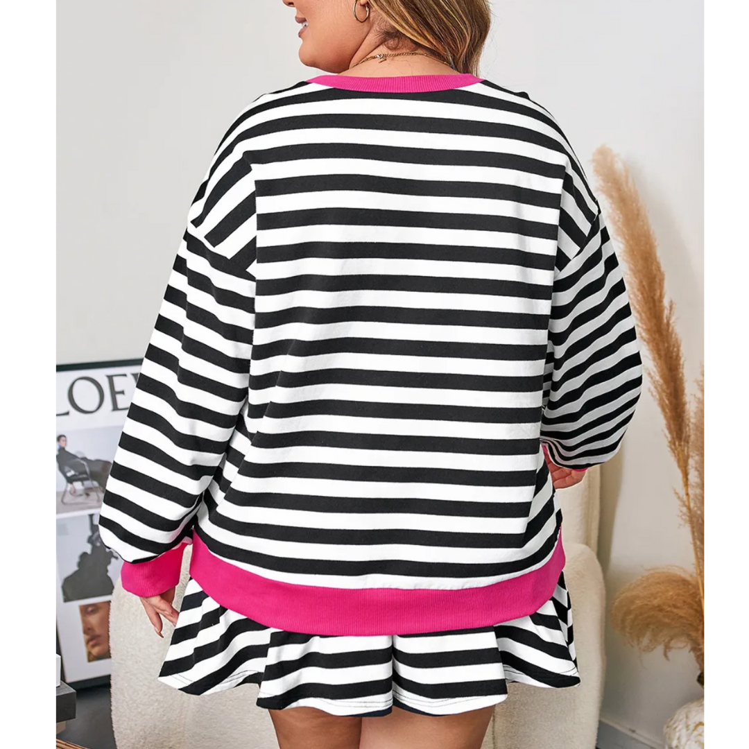 Make casual days pop with the Bold & Bright Stripes Set—a playful mix of comfort and standout style. Featuring classic black-and-white horizontal stripes with vibrant hot pink accents at the collar, cuffs, waistband, and pockets, this set brings fresh energy to your everyday look. The relaxed-fit long-sleeve top pairs perfectly with the flowy shorts for effortless wear whether you’re lounging, running errands, or catching up with friends.