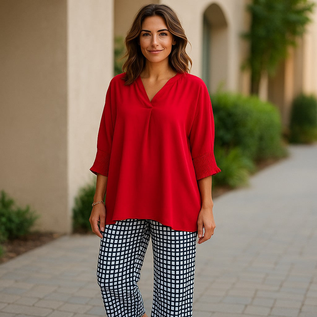 Step into confidence and color with our Boldly Yours blouse — the perfect blend of elegance and ease. This vibrant red top is crafted with a flattering v-neckline and a flowy silhouette that feels as good as it looks. The standout feature? Smocked 3/4 sleeves that add just the right amount of detail and charm. Whether you're heading to work, a lunch date, or a night out, this blouse brings bold beauty to every moment. eta 2 weeks