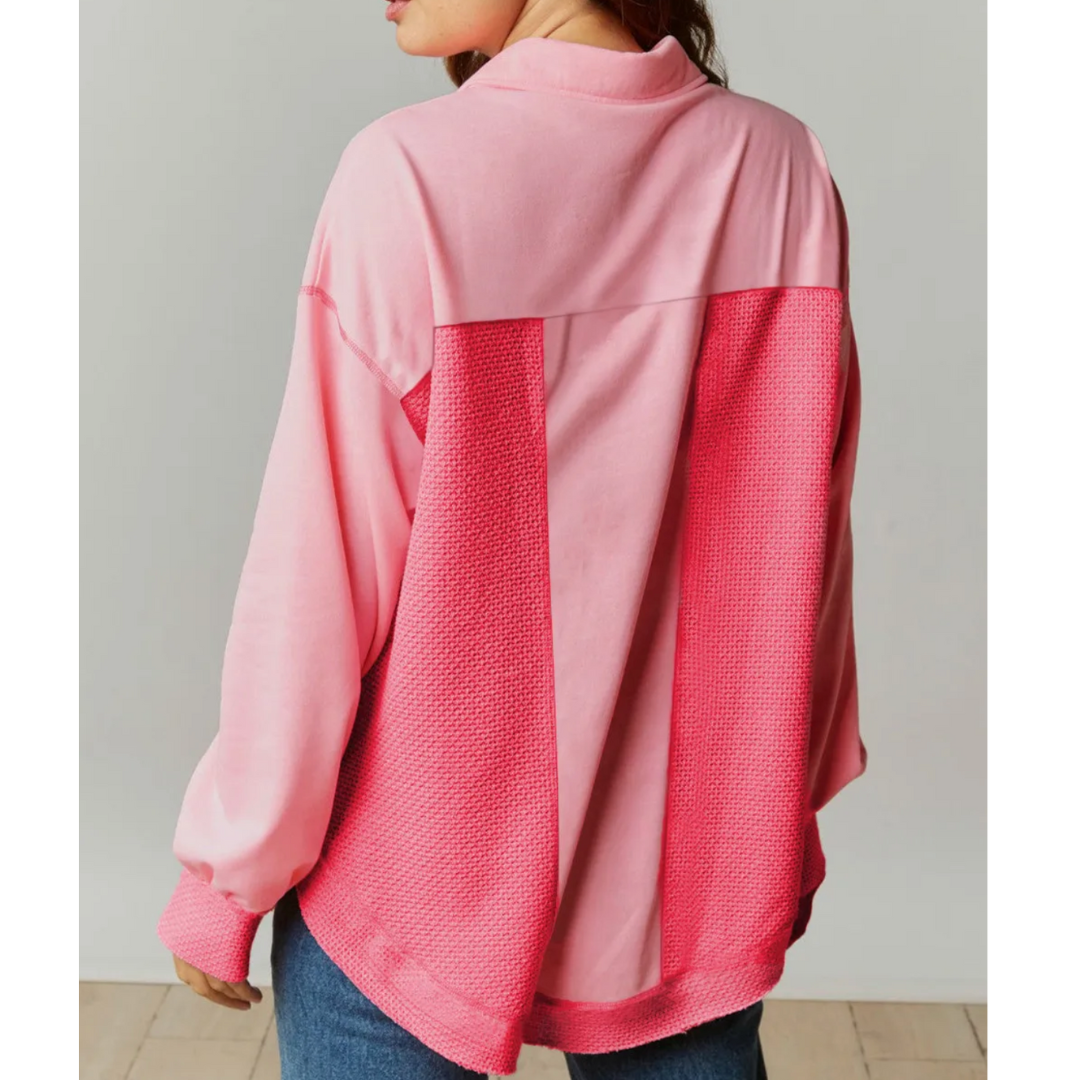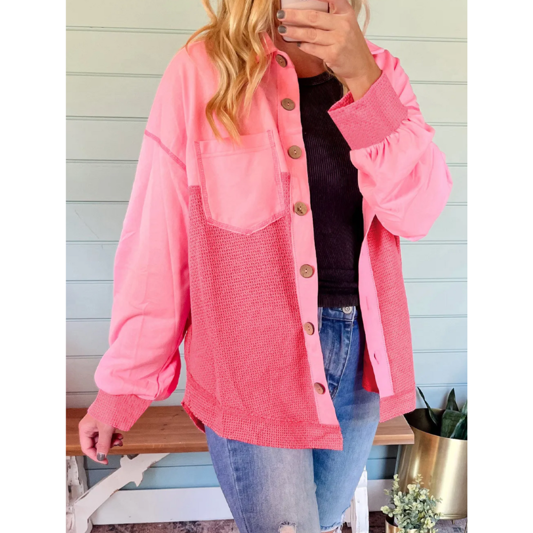 Add a pop of playful color to your wardrobe with the Bubble Pop Textured Shacket. Designed in vibrant shades of pink, this piece blends a woven waffle-knit texture with smooth cotton panels for a bold, mixed-media look. The oversized fit, dropped shoulders, and button-front style make it perfect for layering, while the chest pockets and wooden button details bring in casual-chic charm. Whether you wear it as a lightweight jacket or a statement top, this shacket is all about fun meets functionality.