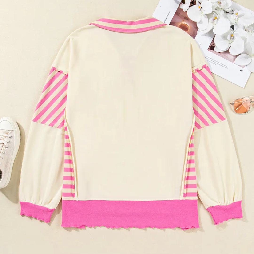 Brighten up your everyday look with the Bubblegum Glow Pullover—a playful mix of cozy comfort and bold style. The soft cream body is elevated by candy-pink striped accents along the collar and sleeves, while hot pink ribbed cuffs and hem add an extra pop of fun. Finished with a raw-edge hem for that effortless, lived-in vibe, this pullover is perfect for casual days that still deserve a touch of flair. Pair it with denim for a relaxed weekend look or leggings for easygoing comfort.
