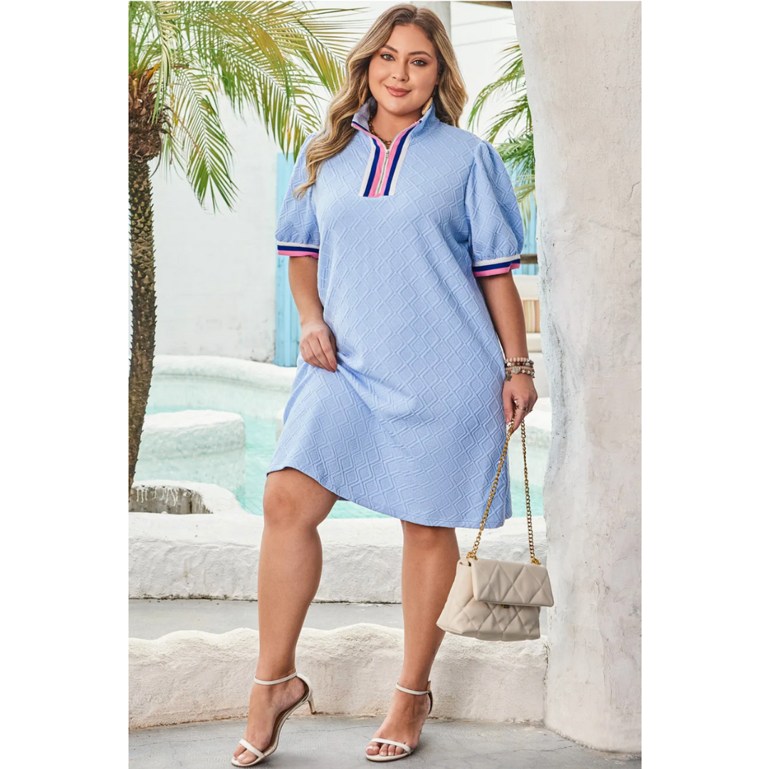 Meet the dress that does it all — flattering, comfortable, and full of confidence. The Buy Myself Confidence Dress is designed just for our curvy girls, featuring a beautifully textured fabric with a luxe diamond pattern, playful puff sleeves, and sporty stripe accents at the collar and cuffs. With a relaxed fit that skims your curves and hidden side pockets for added ease, this dress is perfect for everything from casual outings to weekend brunches. Feel confident, polished, and completely you — because style should celebrate every inch. eta 2 weeks