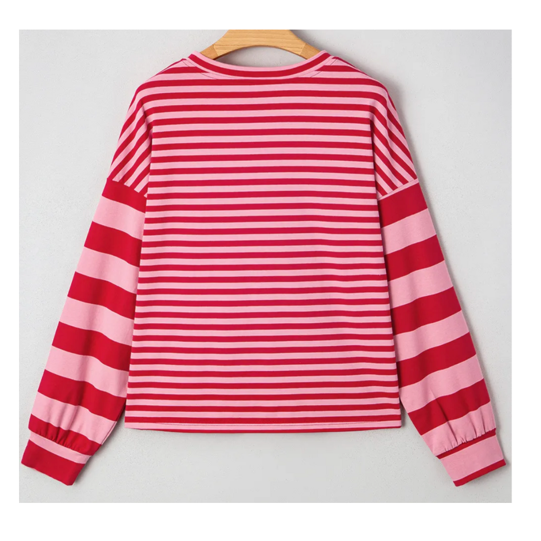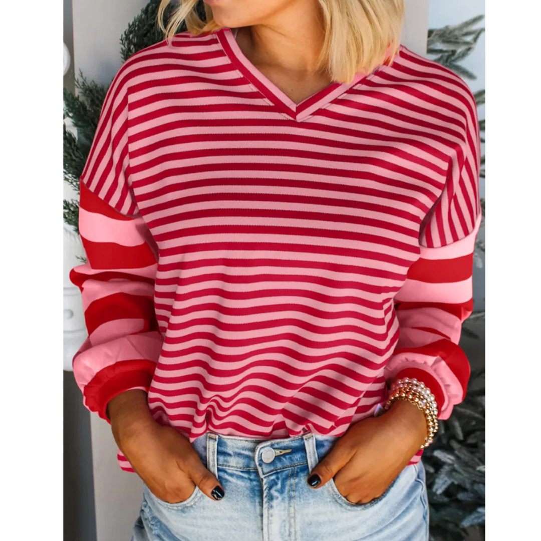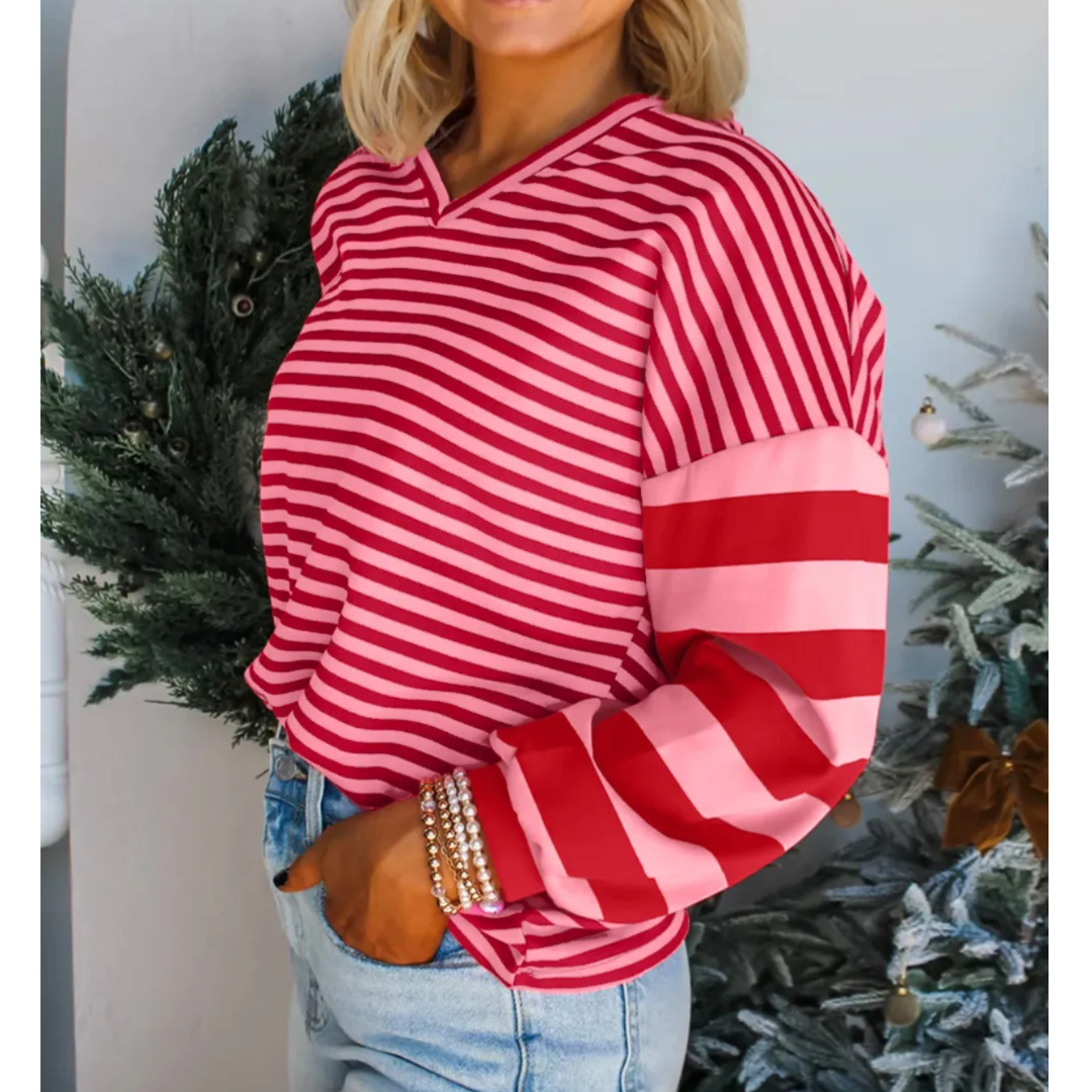 Bring a pop of playful charm to your casual wardrobe with the Candy Cane Daydream Top. This long-sleeve pullover blends vivid pink and red stripes in a mix of horizontal and color-blocked patterns for a look that's both festive and fresh. The V-notch neckline adds a touch of relaxed style, while the soft, breathable fabric keeps you comfortable all day. Perfect for everything from coffee runs to cozy holiday gatherings, this top is your go-to for cheerful, effortless style.