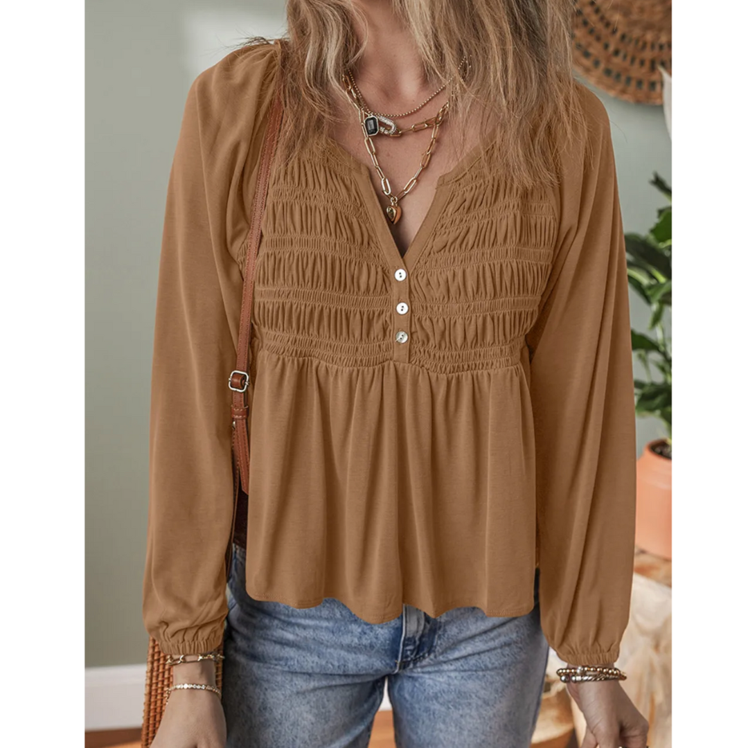 The Caramel Breeze Smocked Blouse is an effortlessly chic piece designed for everyday comfort with a touch of elegance. Crafted in a warm caramel hue, it features a flattering V-neckline with button detailing, smocked bodice for added texture, and a relaxed peplum silhouette that flows beautifully. Long sleeves with elastic cuffs complete the look, making it versatile enough for both casual days and dressed-up evenings.