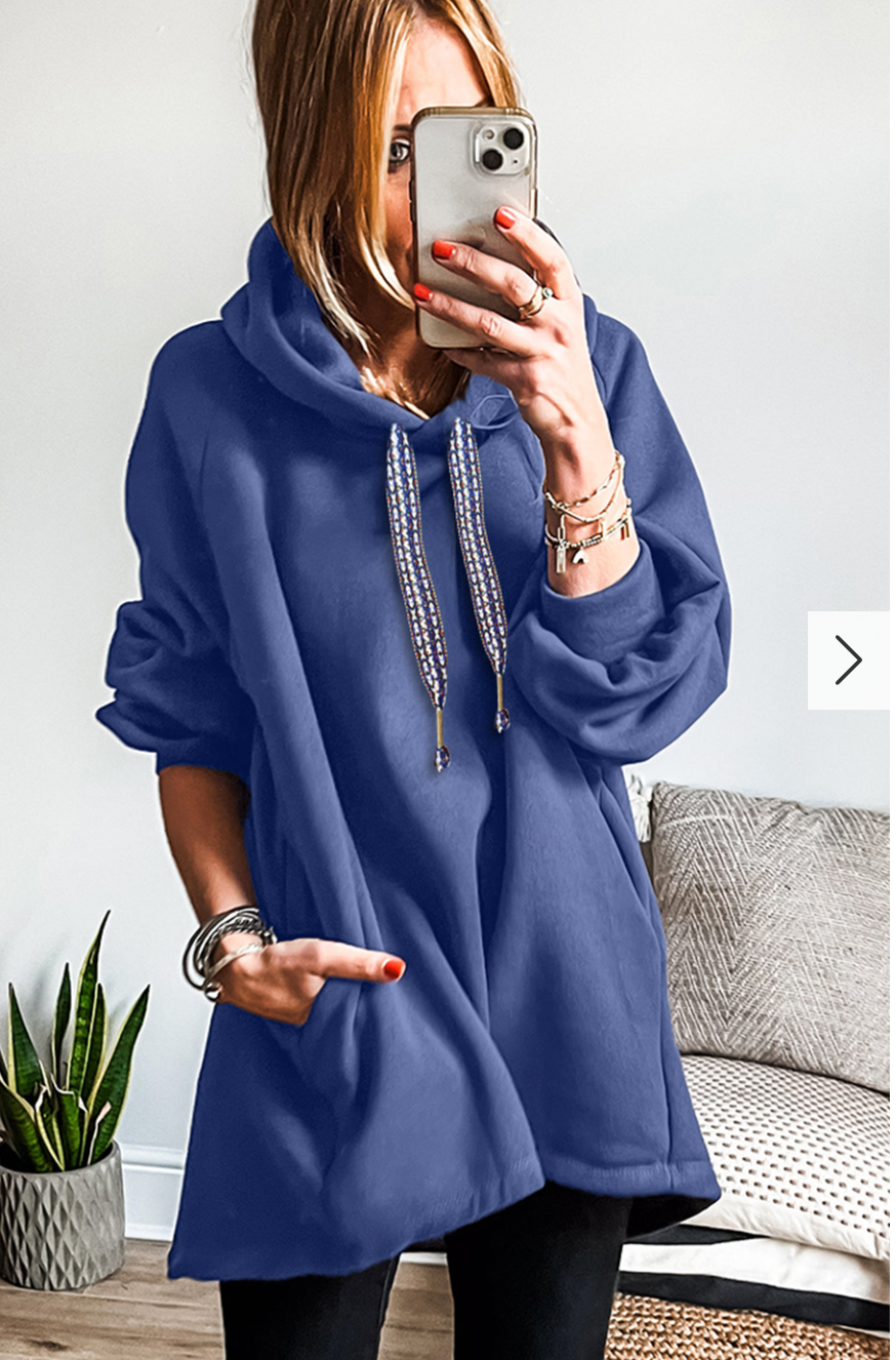 Slip into cozy perfection with our Chill Mode Longline Hoodie, where laid-back style meets elevated detail. Crafted in a rich sapphire blue, this relaxed-fit hoodie features a flattering longline silhouette, roomy hood, and eye-catching patterned drawstrings with gold accents for that extra touch of personality. The soft, mid-weight fabric keeps you comfortable whether you’re lounging at home, running errands, or pairing it with leggings for a casual day out.
