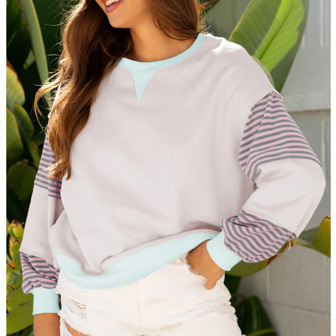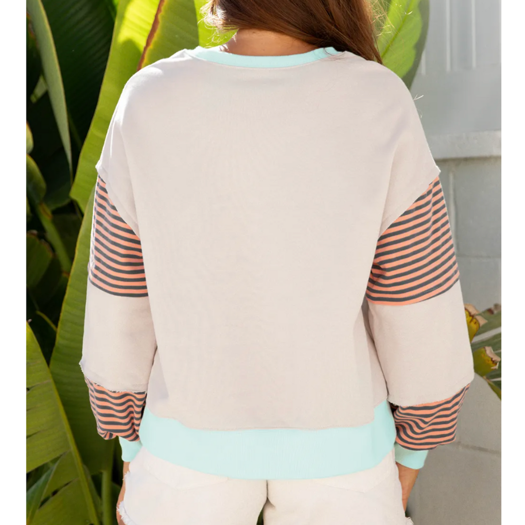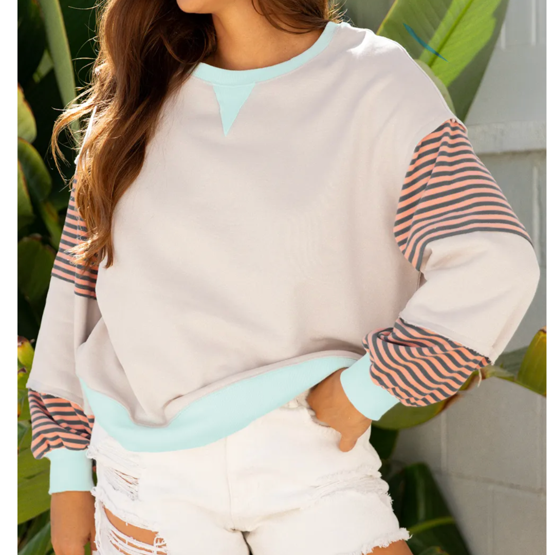 Bring laid-back vibes and effortless style into your wardrobe with the Coastal Stripe Contrast Sweatshirt. Featuring a relaxed fit and playful striped sleeves, this pullover blends comfort and personality in one must-have piece. The contrast neckline, cuffs, and hem add a pop of color, making it easy to pair with your favorite shorts, jeans, or joggers for a casual yet chic look. Whether you're heading to the beach, lounging at home, or running errands, this sweatshirt delivers cozy versatility all year round.