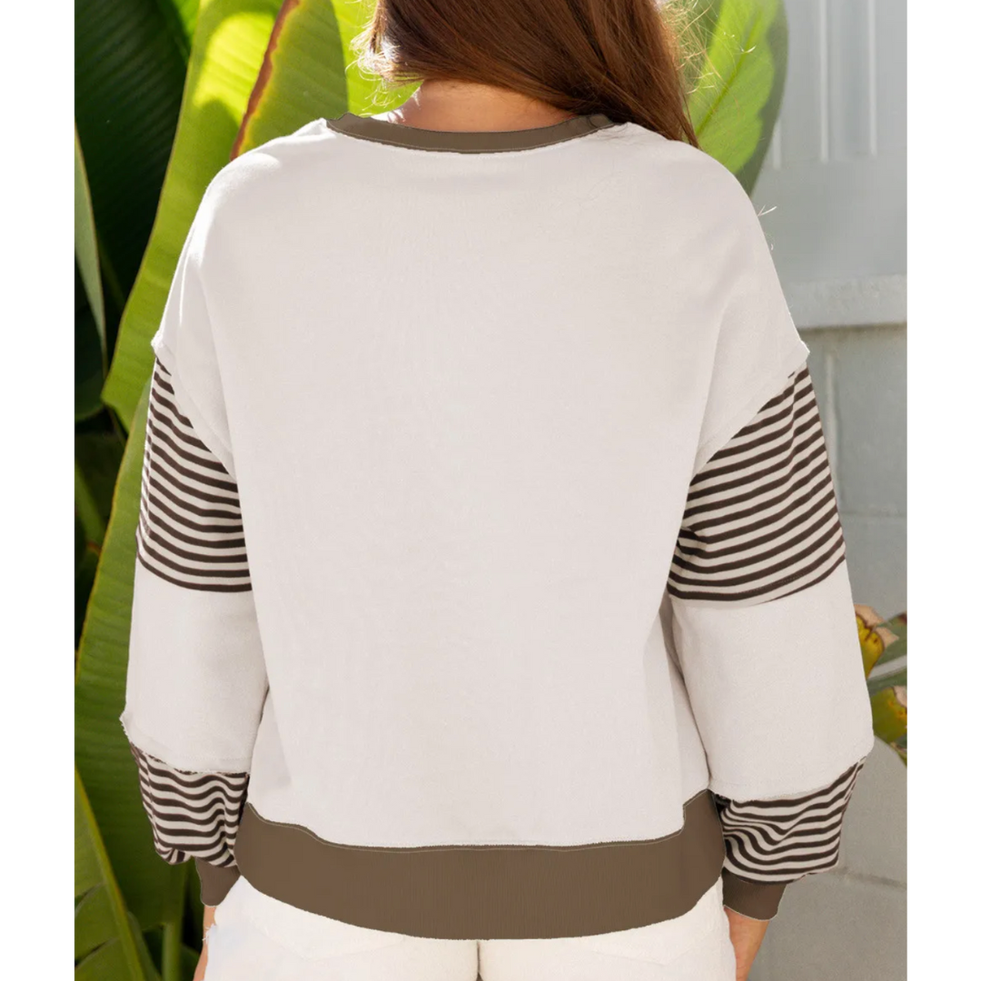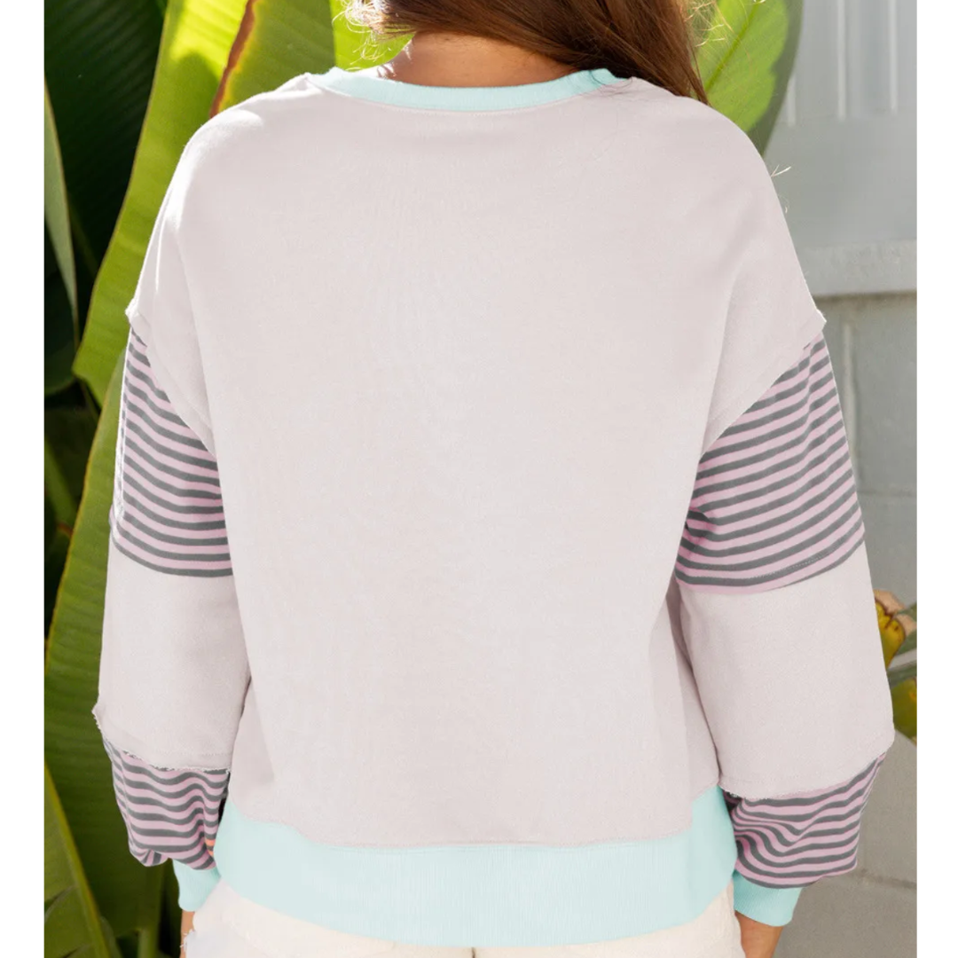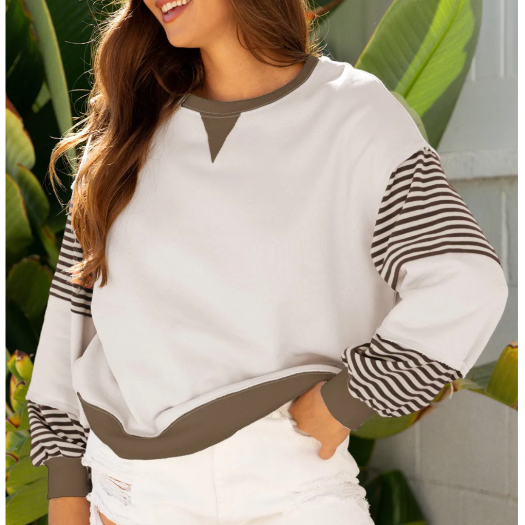 Bring laid-back vibes and effortless style into your wardrobe with the Coastal Stripe Contrast Sweatshirt. Featuring a relaxed fit and playful striped sleeves, this pullover blends comfort and personality in one must-have piece. The contrast neckline, cuffs, and hem add a pop of color, making it easy to pair with your favorite shorts, jeans, or joggers for a casual yet chic look. Whether you're heading to the beach, lounging at home, or running errands, this sweatshirt delivers cozy versatility all year round.