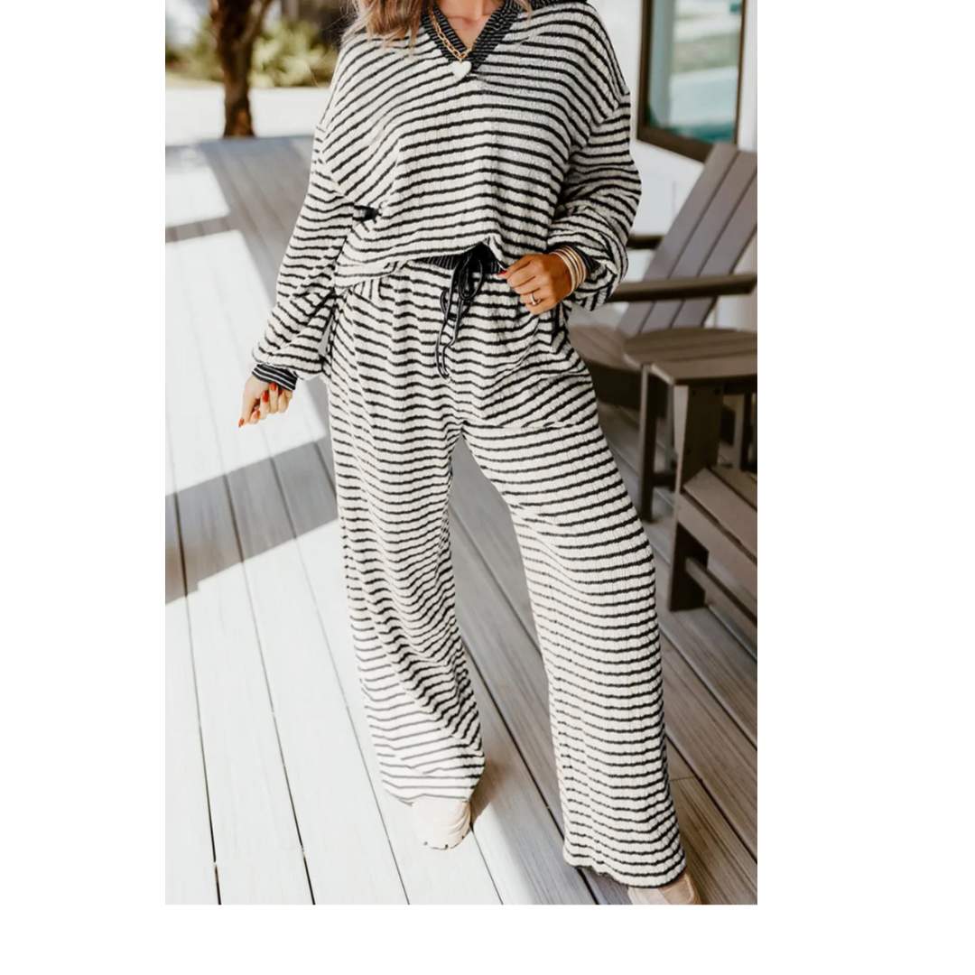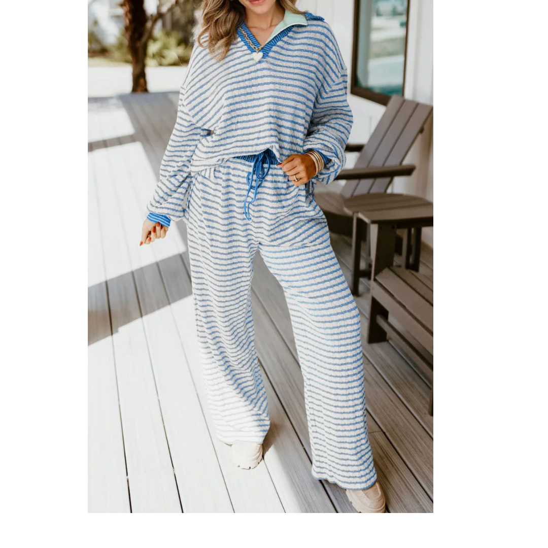 Effortlessly chic and endlessly comfortable, the Coastal Stripe Lounge Set is your go-to for relaxed days and elevated casual style. Featuring soft, breathable knit fabric in timeless stripes, this two-piece set is designed with a slouchy pullover top and wide-leg drawstring pants that move with you. Perfect for lounging at home, strolling by the beach, or running errands with a touch of laid-back sophistication.