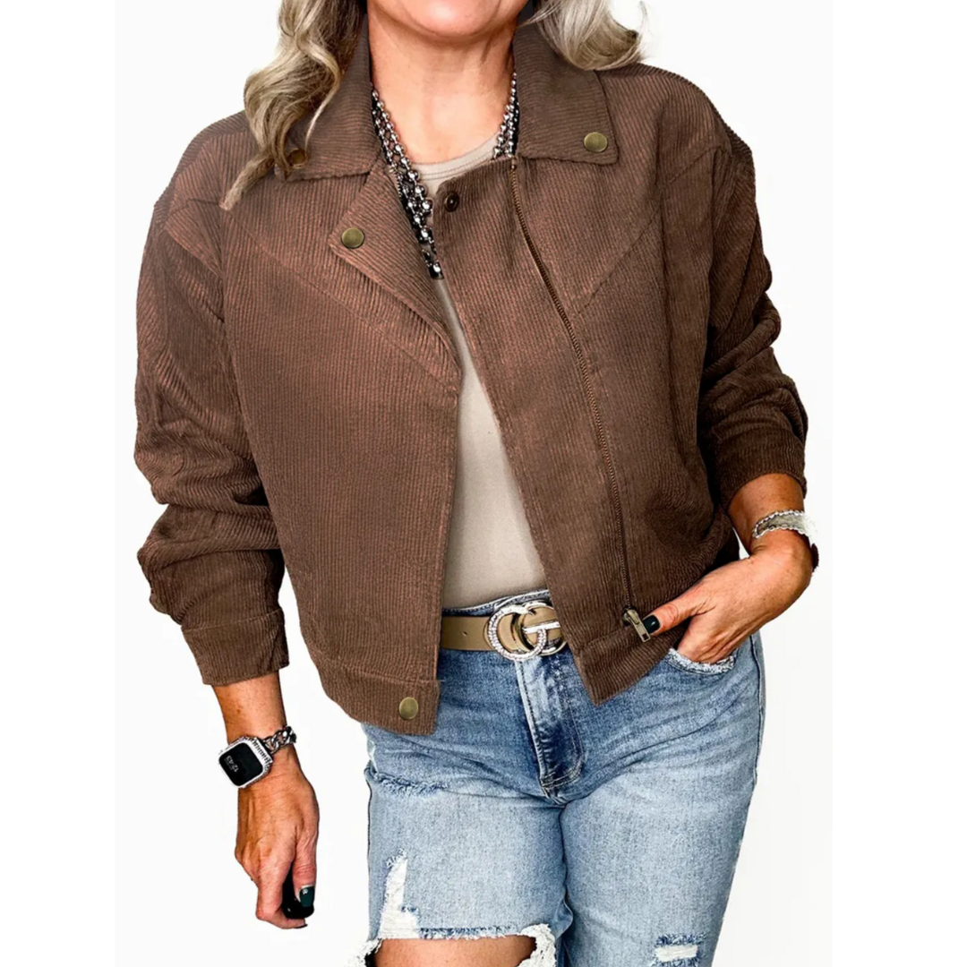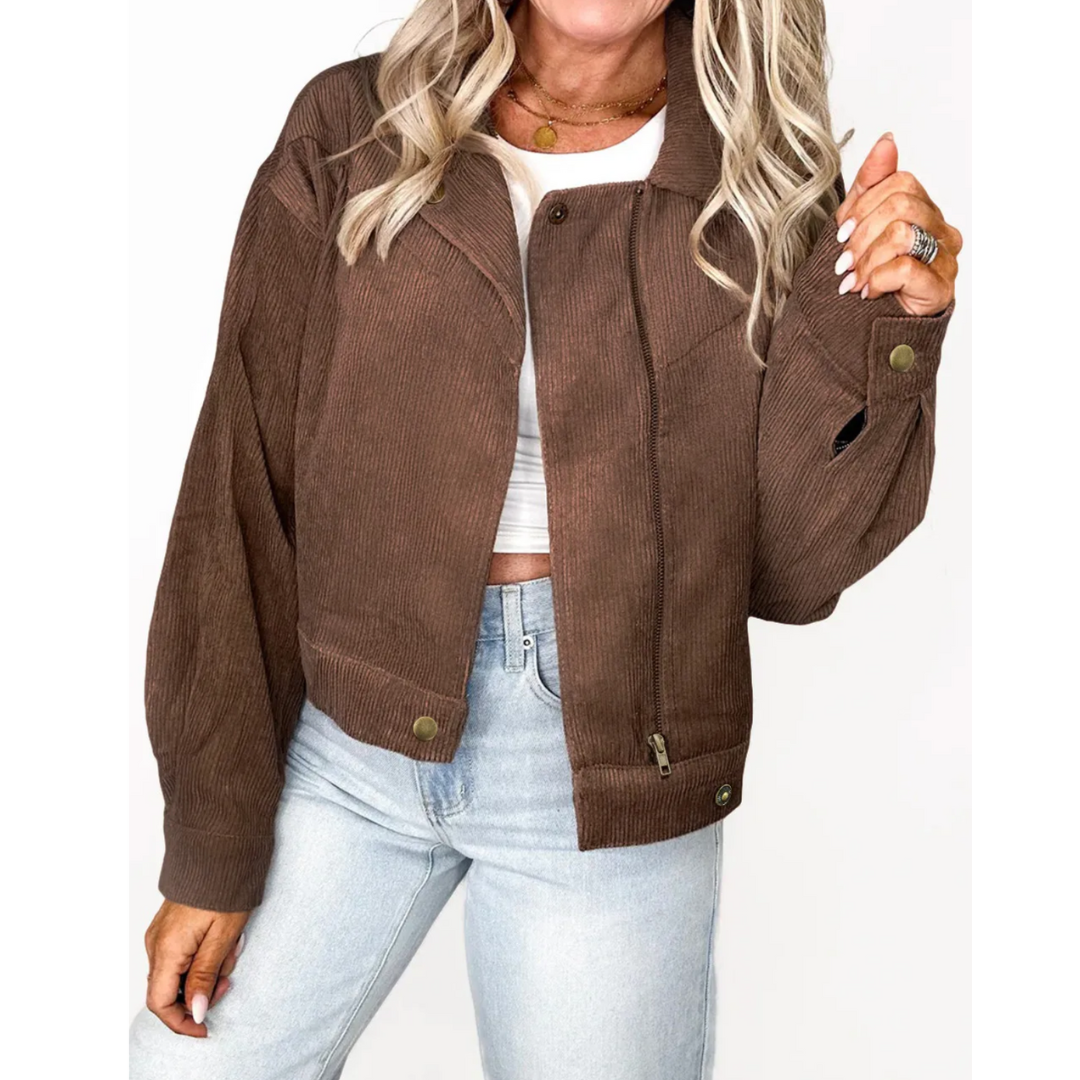 The Cocoa Corduroy Cropped Jacket is the perfect blend of cozy texture and modern edge. Designed in a rich chocolate brown corduroy, this jacket brings timeless style with a fresh twist. The cropped cut flatters your silhouette while the structured collar, snap-button accents, and zip closure add versatile styling options. Drop shoulders and relaxed sleeves keep it effortlessly casual, making it easy to dress up or down. Pair it with jeans for a laid-back vibe or layer it over a dress for chic contrast.