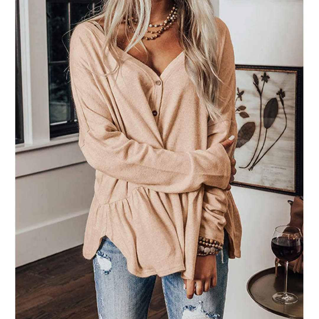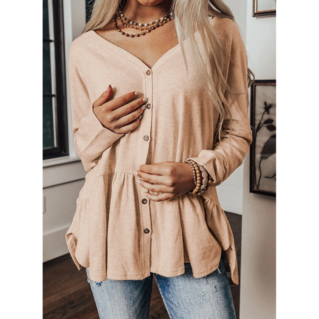 Slip into the softest comfort with our Cozy Up & Button Down top — the perfect blend of laid-back charm and feminine flair! This long sleeve peplum-style button-down top features an ultra-soft, stretchy knit fabric that moves with you and feels like a gentle hug. With a flattering V-neckline and ruffle hem that adds just the right touch of whimsy, it's perfect for everything from lounging at home to a casual night out. Pair it with denim, leggings, or layer it over a cami for effortless style.