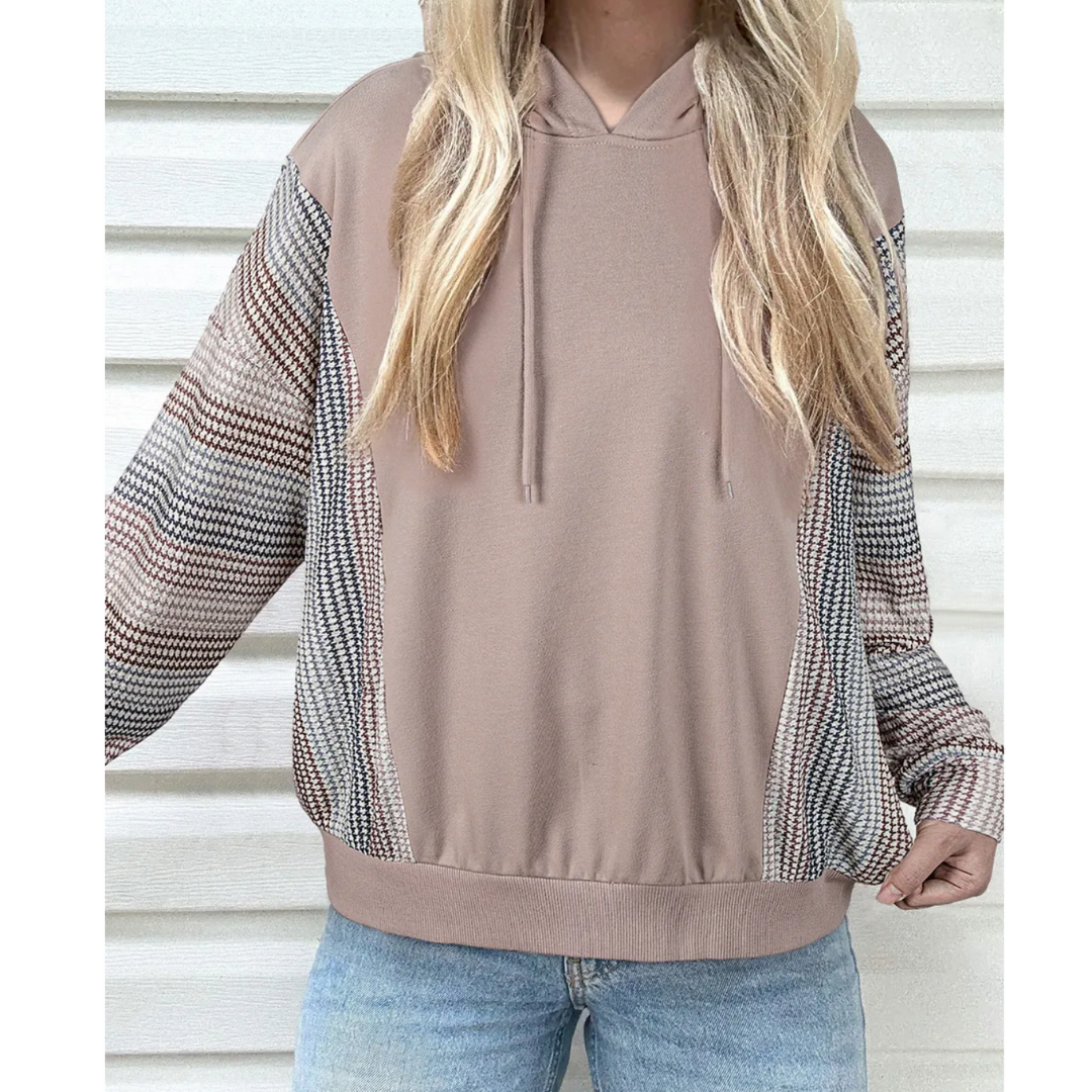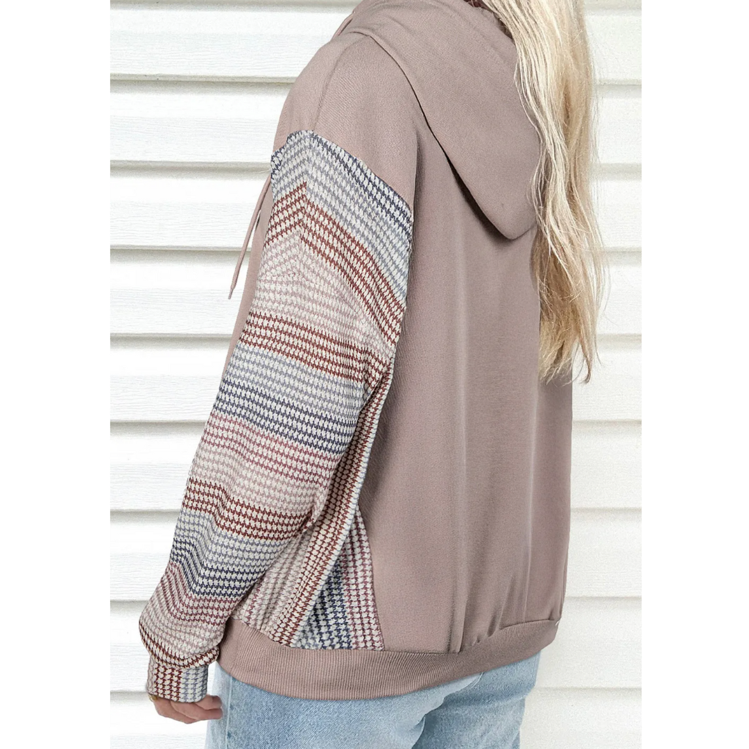 The Desert Horizon Hoodie blends everyday comfort with subtle, stylish detail. Featuring a soft taupe body accented by multicolor woven-pattern sleeves, this hoodie offers a relaxed fit perfect for layering or wearing solo. The unique sleeve design brings a pop of texture and color contrast, giving your casual look a modern, boho-inspired twist.