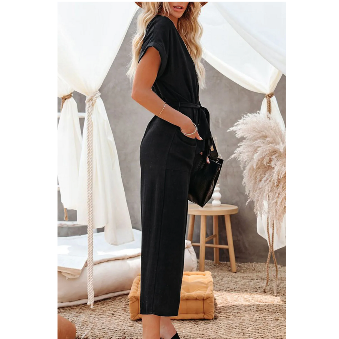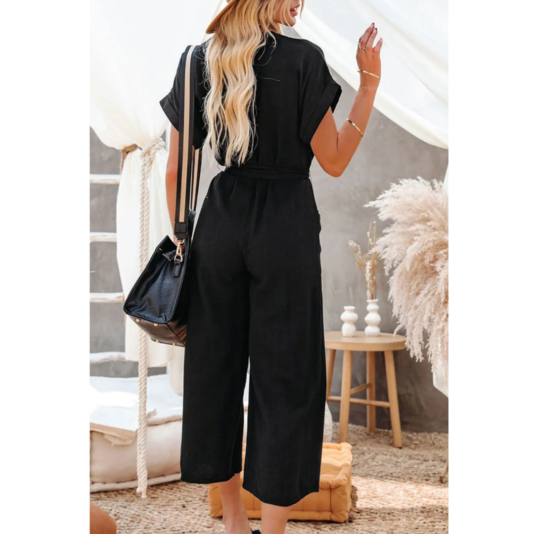 Step into chic comfort with the Effortlessly Yours Jumpsuit – your new wardrobe staple for anything from market strolls to casual evenings out. This black jumpsuit is the definition of laid-back luxe, featuring a soft lightweight fabric, functional button front, wide cropped legs, and a removable self-tie belt to flatter every shape. The short cuffed sleeves and roomy front pockets make it as practical as it is stylish. Dress it up with heels or keep it casual with sandals – either way, you’ll look effortlessly put together.