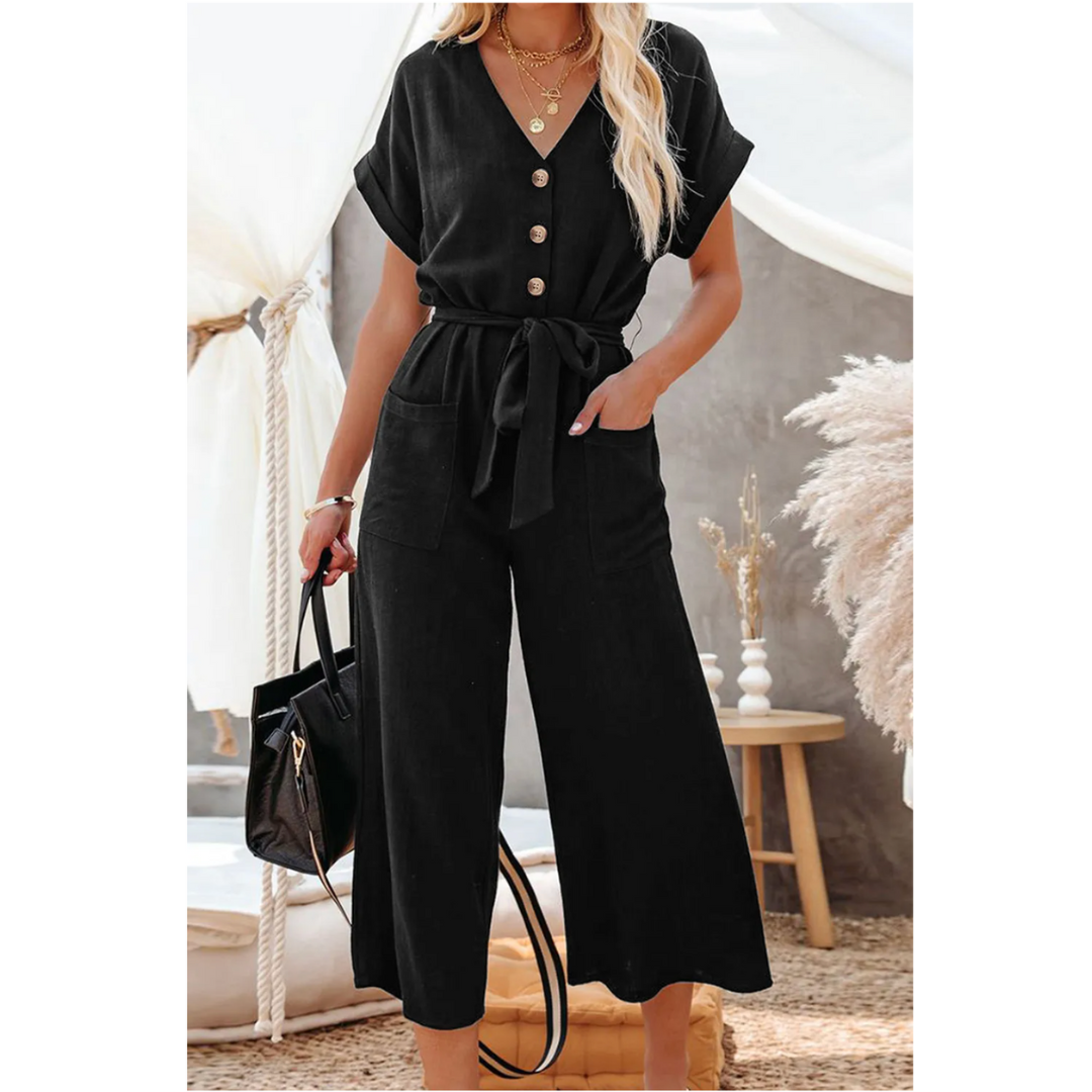 Effortlessly Yours, Button Front Belted Black Jumpsuit