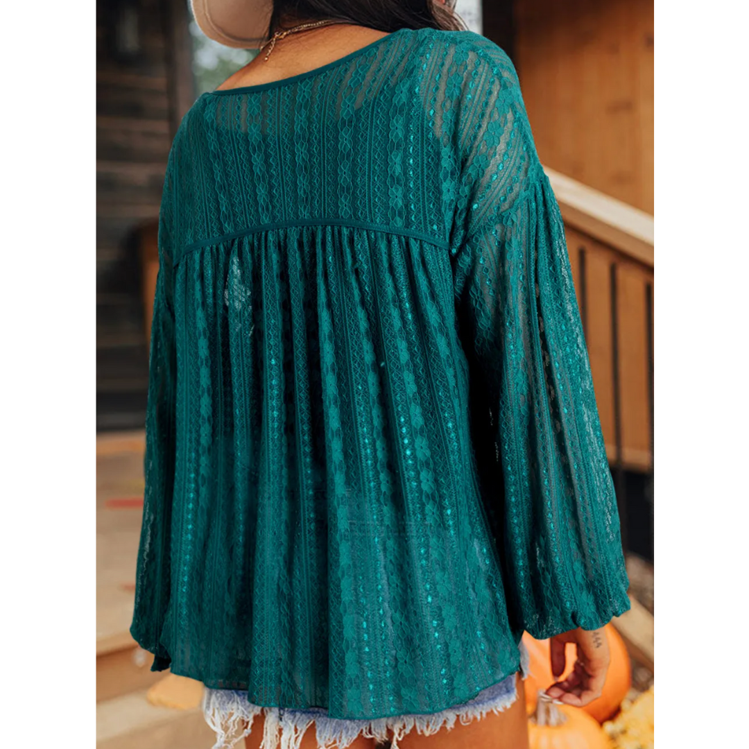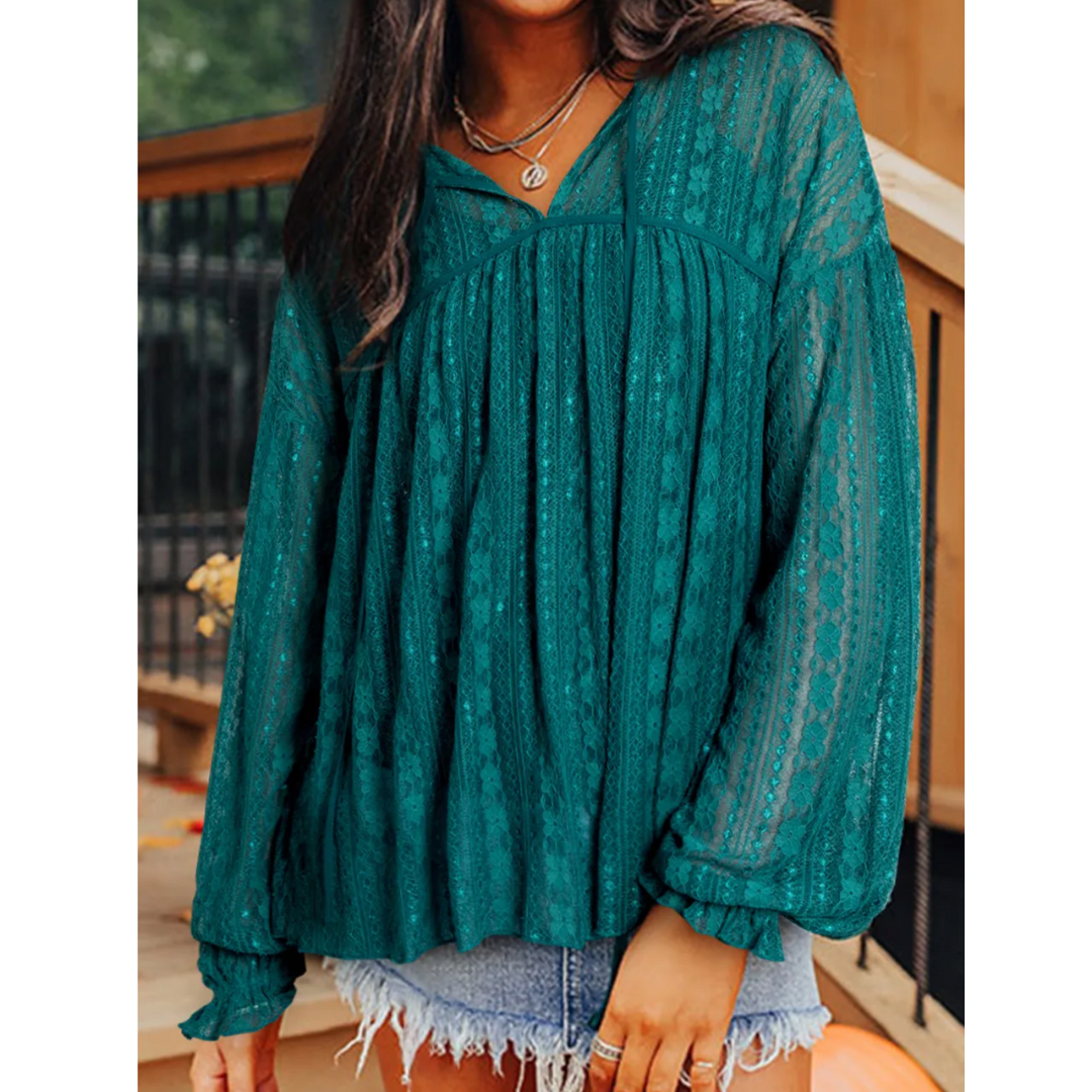 The Emerald Breeze Lace Blouse is a dreamy blend of boho charm and effortless elegance. Crafted with sheer lace detailing, this lightweight blouse features flowy long sleeves, a relaxed fit, and a gathered front yoke that adds just the right amount of texture and movement. Its deep emerald hue makes it a standout piece that transitions seamlessly from day to night. Pair it with denim cutoffs for a casual vibe or with tailored trousers for a polished look.