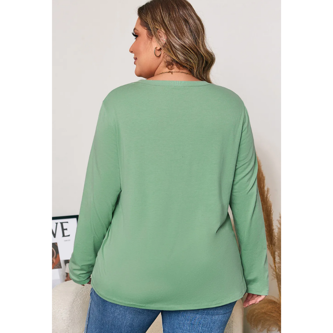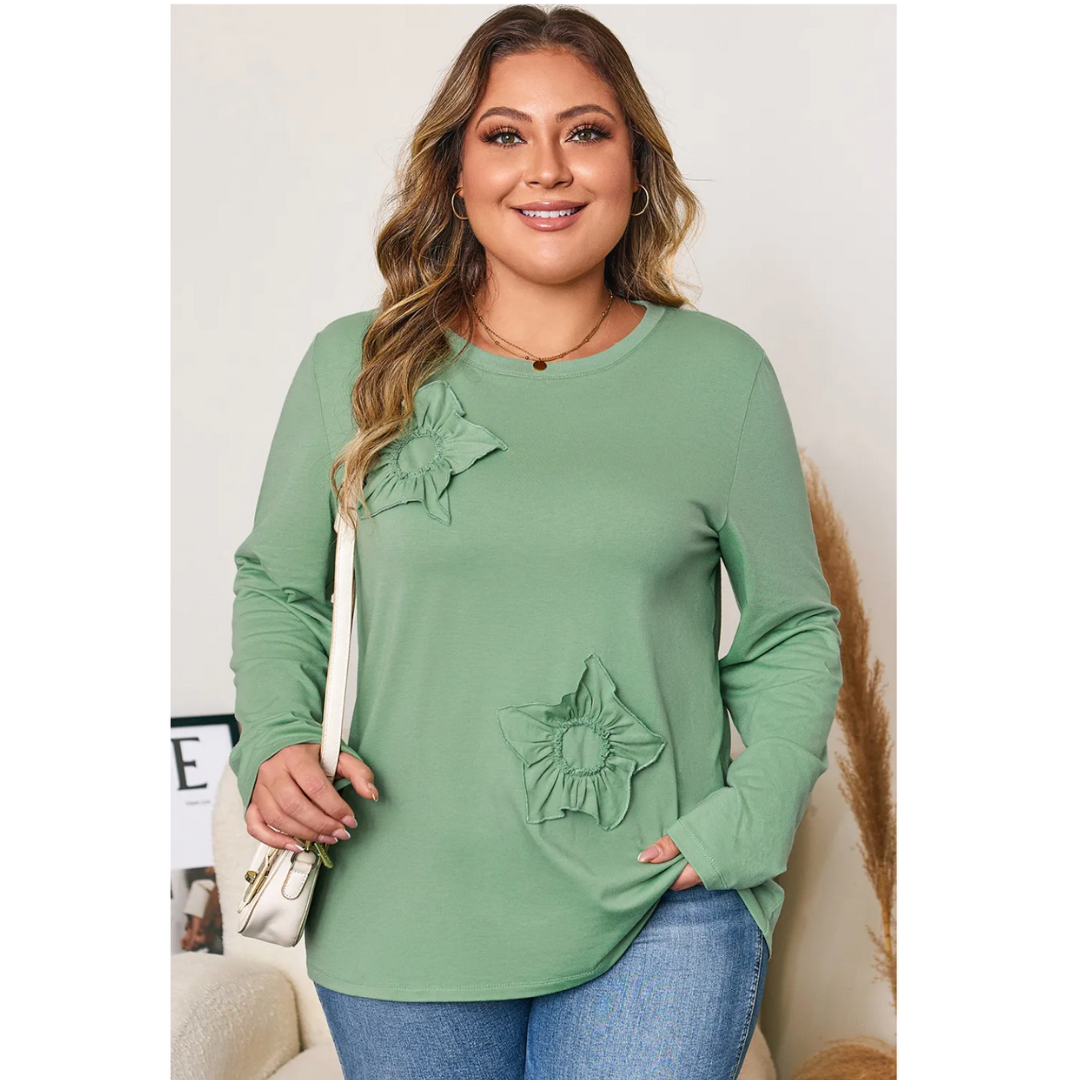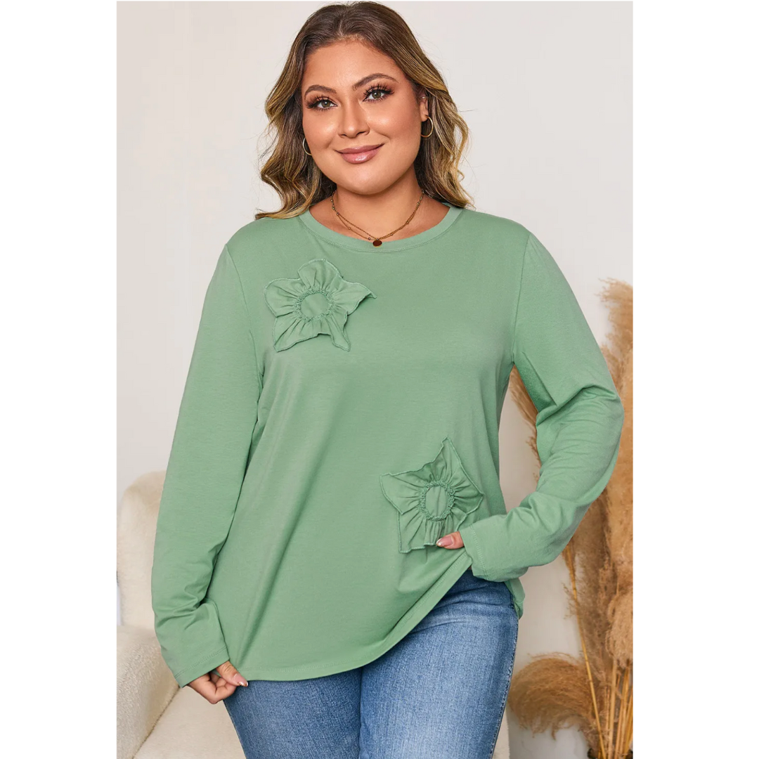 Add a touch of blooming beauty to your everyday look with the Flourish & Feel Good top. Designed for curvy girls who love comfy-cute style, this sage green long sleeve tee features soft and stretchy fabric that hugs in all the right places — while keeping you ultra-comfy. The standout detail? Two adorable 3D floral appliqués that give this top a unique, feminine finish. Pair it with jeans or leggings for effortless charm wherever you go.