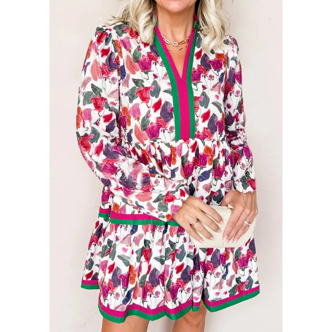 Bring vibrant energy to your wardrobe with the Garden Bloom Dress. This playful piece features a lively floral print in shades of magenta, violet, orange, and emerald, beautifully contrasted with bold green trim. Designed with a flattering tiered silhouette, long sleeves, and a V-neckline, it’s perfect for everything from brunch dates to garden parties. Lightweight and breezy, this dress will keep you stylish and comfortable no matter the season.