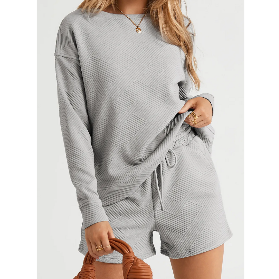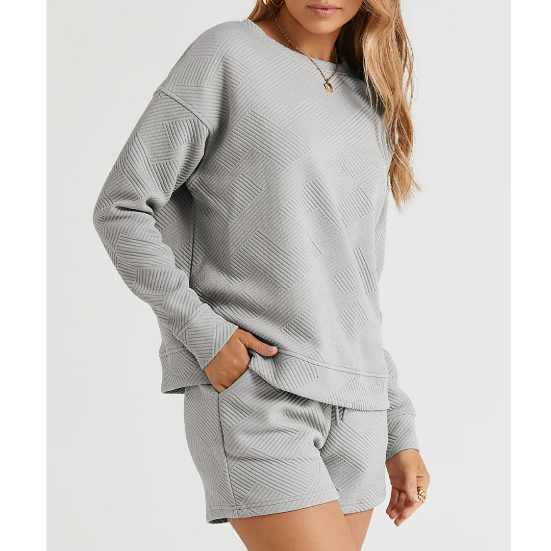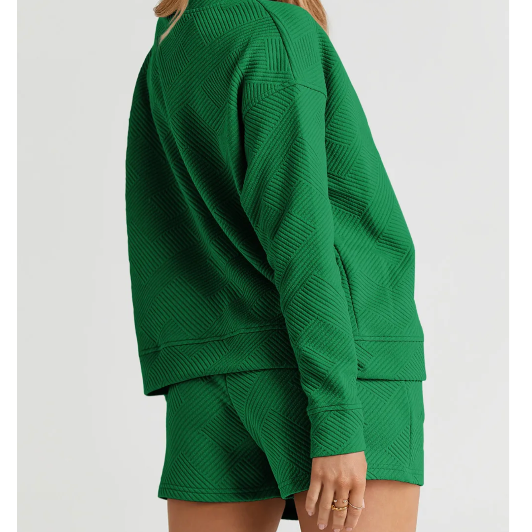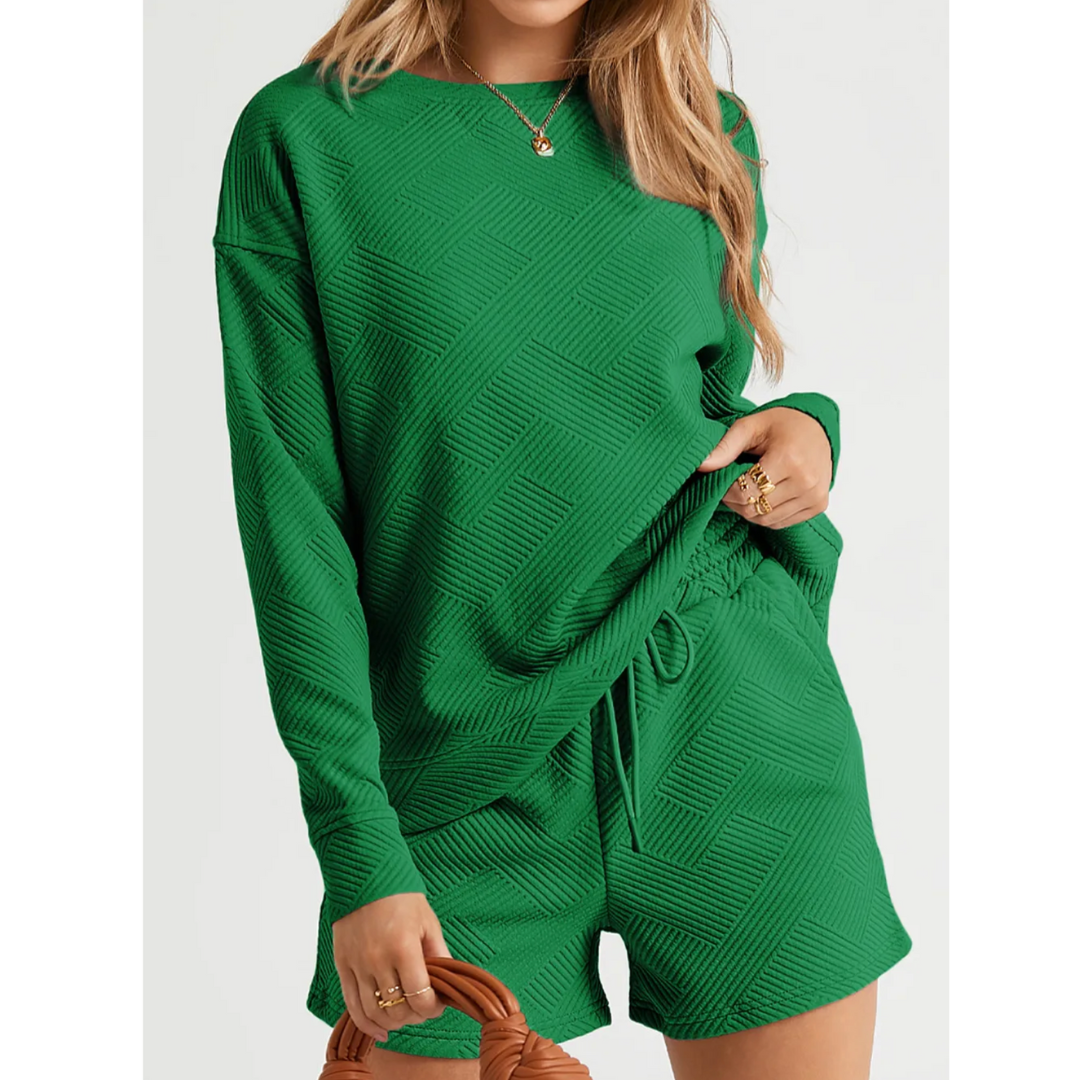 Elevate your casual days with the GeoChic Textured Lounge Set. This matching top-and-shorts duo blends effortless comfort with modern style, featuring a bold geometric embossed pattern that adds depth and personality. The relaxed-fit pullover and adjustable drawstring shorts make it perfect for everything from cozy mornings to coffee runs. Available in striking emerald green or sleek stone gray, it’s the lounge look that feels as good as it looks.