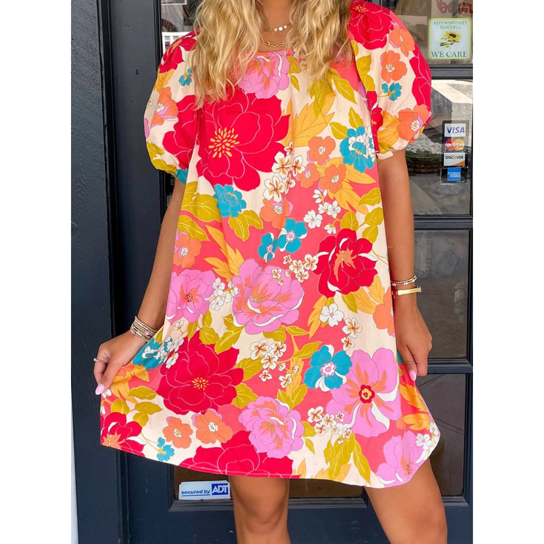 Turn up the color and the charm in our Get Loud Floral Dress! This lively little number features playful short puff sleeves, a classic round neckline, and a flattering, easygoing fit. Bursting with bold, vibrant florals, it’s the perfect dress to brighten any day. Whether you're headed to brunch, a garden party, or just out to soak up some sunshine, this dress makes sure all eyes are on you — in the best way possible! eta 2 weeks