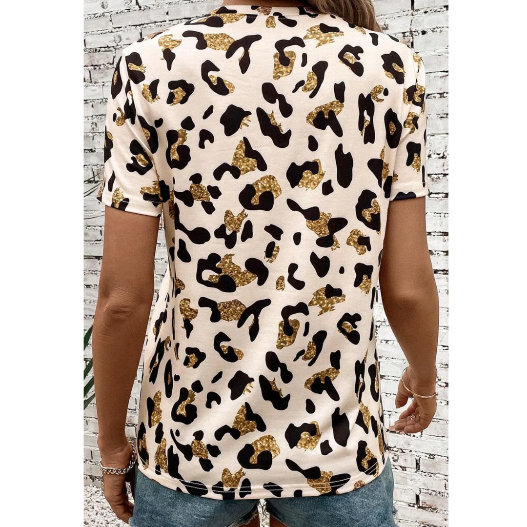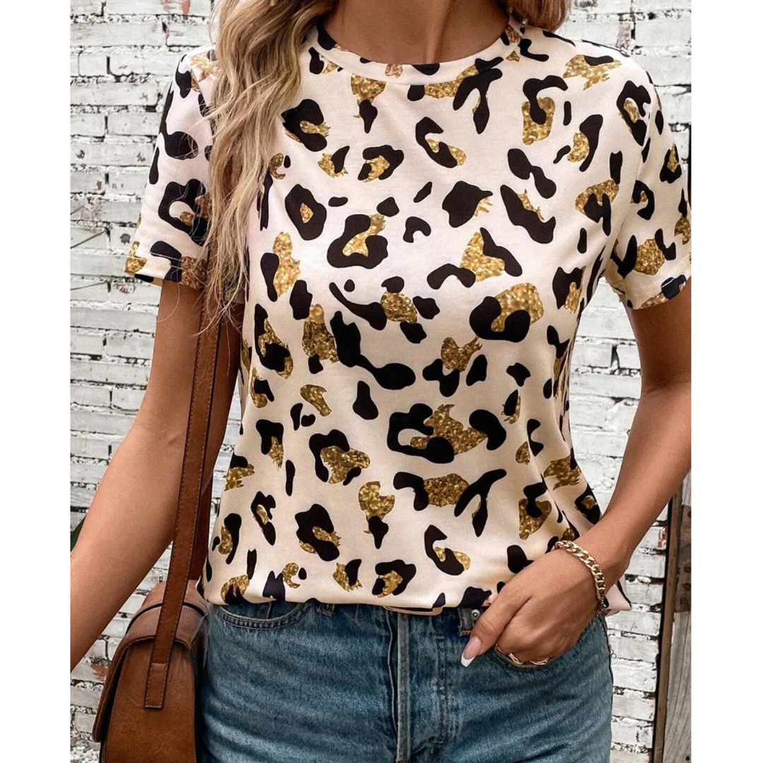 Unleash your bold side with the Golden Wild Tee, a chic twist on a classic animal print. Featuring a cream base splashed with striking black and gold leopard spots, this top brings effortless glamour to your everyday style. Pair it with denim for a laid-back vibe or tuck it into a skirt for a night-out edge. Soft, breathable, and stylishly versatile—this tee is made to stand out.
