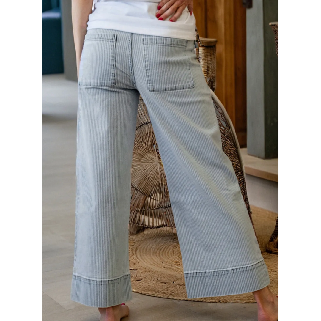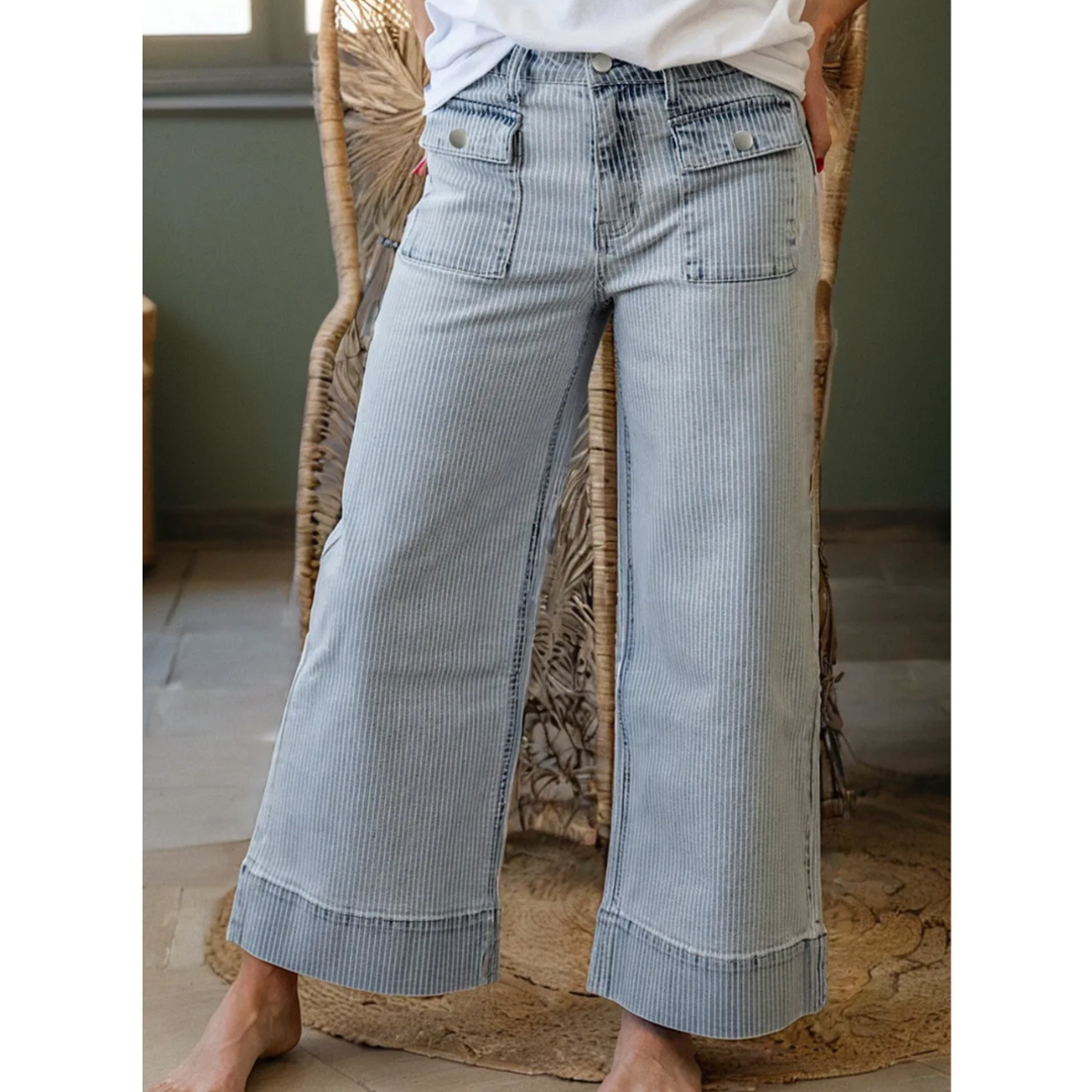 Set sail in style with the Harbor Stripe Wide-Leg Jeans — a fresh take on nautical-inspired denim. Designed with subtle pinstripes, these jeans bring a timeless yet modern vibe to your wardrobe. The wide-leg silhouette offers comfort and movement, while the cropped hem and front buttoned pockets add a playful, utilitarian touch. Perfectly versatile, they can be dressed up with wedges and a blouse or kept casual with sneakers and a tee.