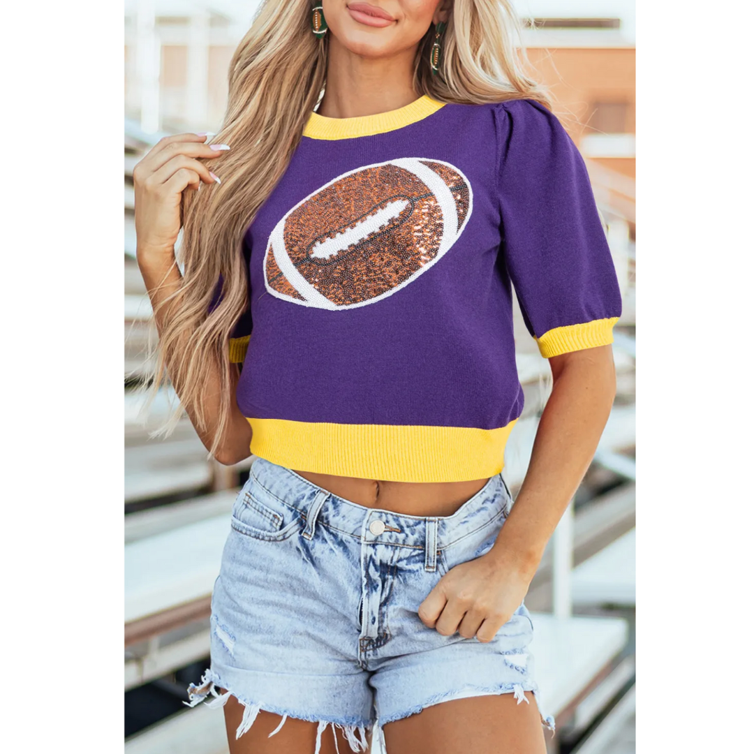 Get game-day glam with a side of sparkle! The Let's Play Ball sweater brings all the energy with its eye-catching sequin football graphic and bold color block trim. Designed with soft knit fabric, puff short sleeves, and a flattering banded waist, this cropped sweater is perfect for stadium stands or sofa cheering. Available in three spirited combos—pink/white, red/black, and purple/yellow—so you can rep your team in serious style!