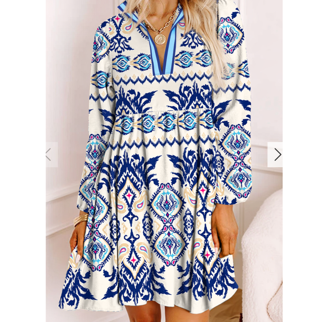 Channel breezy coastal vibes in our Mediterranean Muse Swing Dress. With its eye-catching navy and turquoise boho print, relaxed silhouette, and flattering empire waist, this dress is your go-to for effortless elegance. The lightweight fabric flows beautifully while the bold geometric pattern adds a touch of wanderlust charm. Featuring a split V-neckline trimmed in striking blue, long balloon sleeves with elastic cuffs, and a flirty above-the-knee length — this dress is perfect for dressing up or keeping casual.