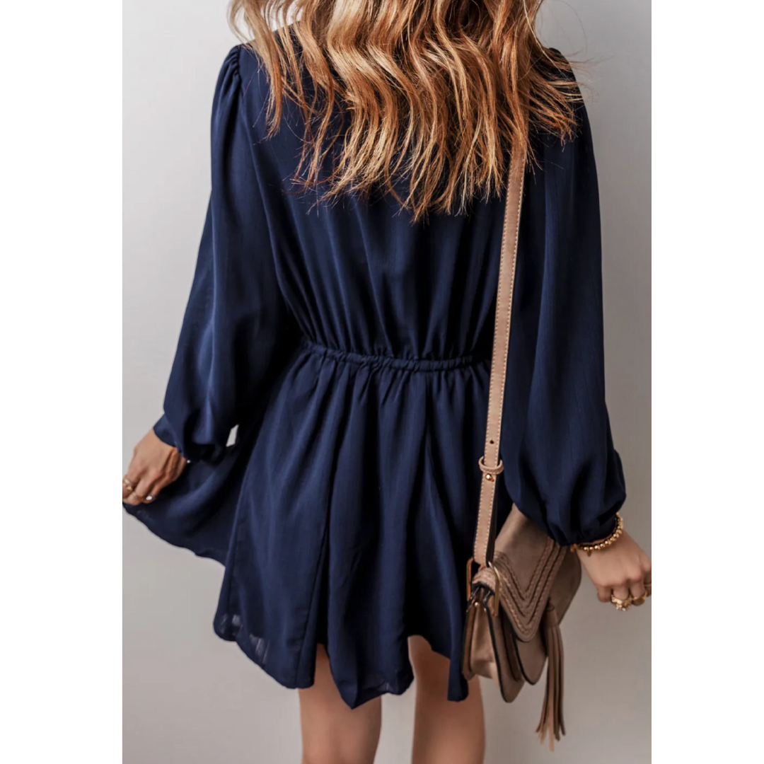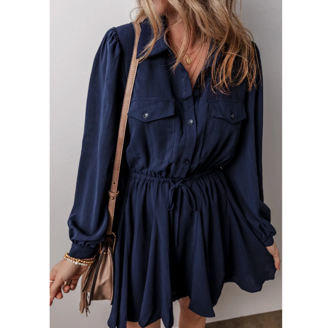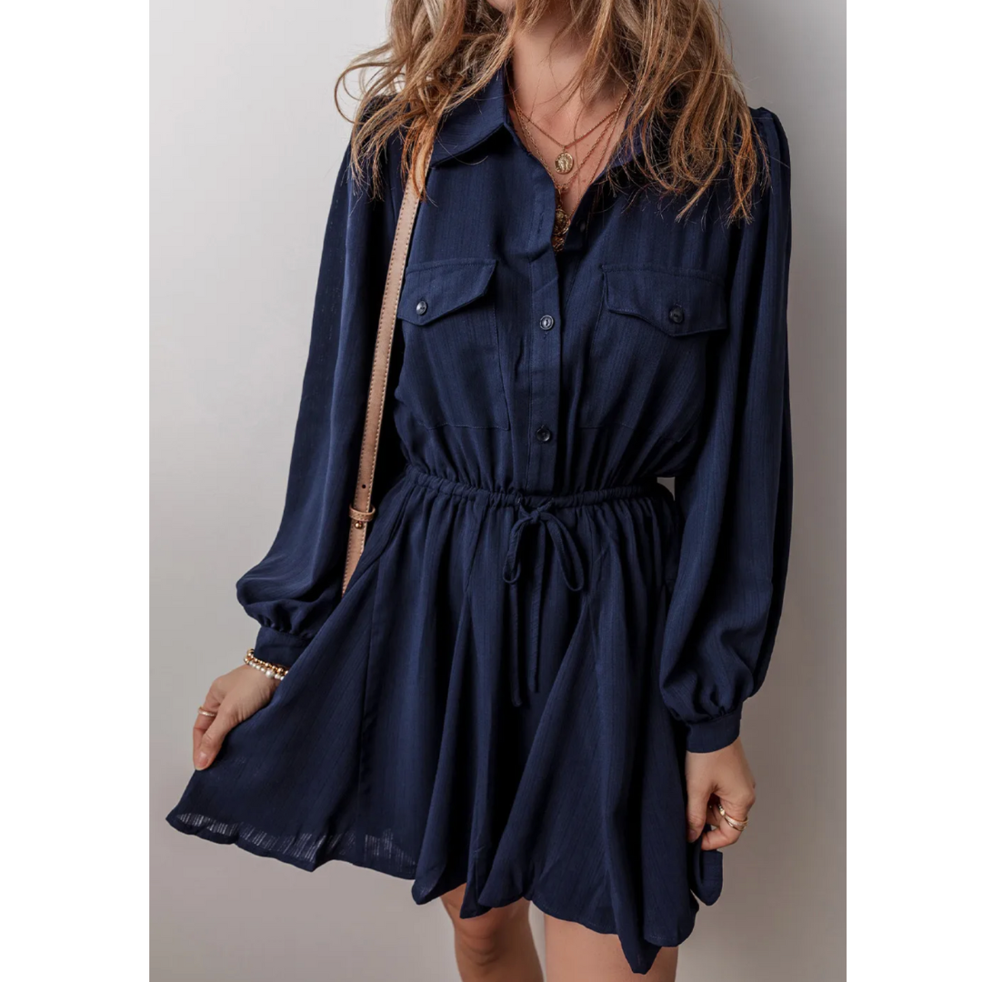 Effortless sophistication meets everyday comfort with the Midnight Breeze Shirt Dress. Designed in a deep navy hue, this dress combines the polished structure of a button-up with the feminine flow of a flared skirt. The drawstring waist flatters your shape while giving you styling versatility—cinch it for a more defined silhouette or keep it relaxed for casual ease. Perfect for day-to-night wear, it’s a wardrobe staple that transitions seamlessly from the office to evening plans.