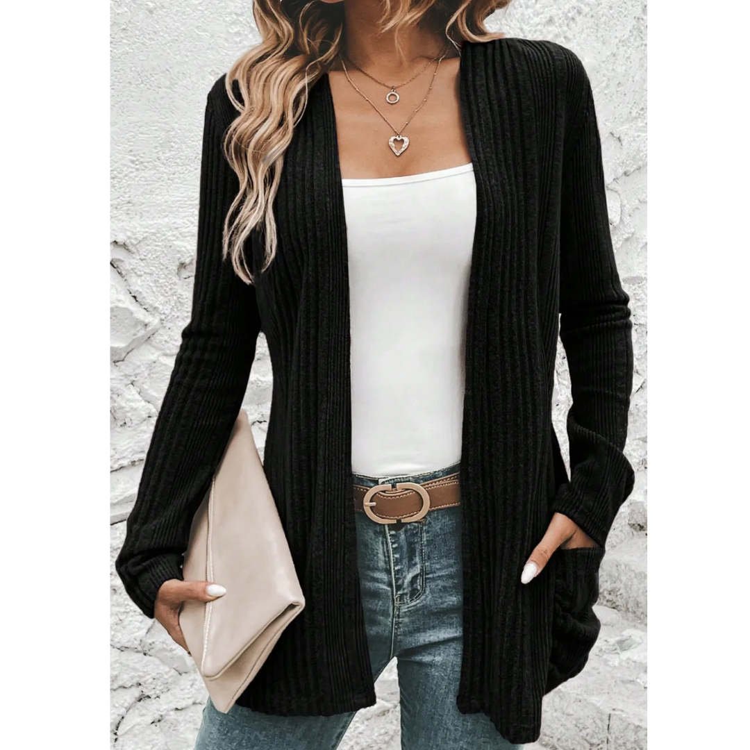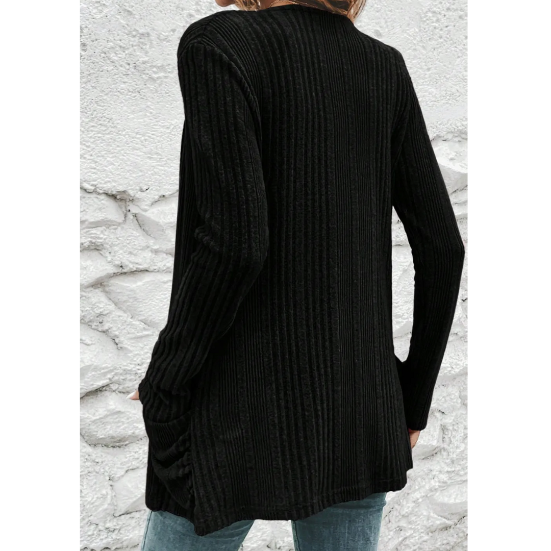 Effortlessly chic and endlessly versatile, the Midnight Ease Cardigan is your go-to layering piece for any season. Designed with a ribbed knit texture, this open-front cardigan drapes beautifully while keeping you cozy. The lightweight fabric allows for all-day comfort, while the long sleeves and side pockets add function to its sleek silhouette. Perfect for pairing with jeans, dresses, or workwear, it’s a timeless essential your wardrobe will thank you for.