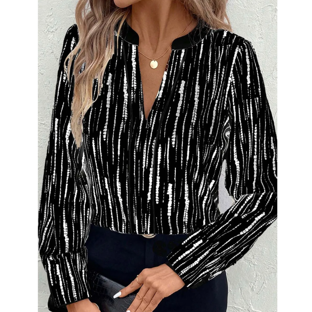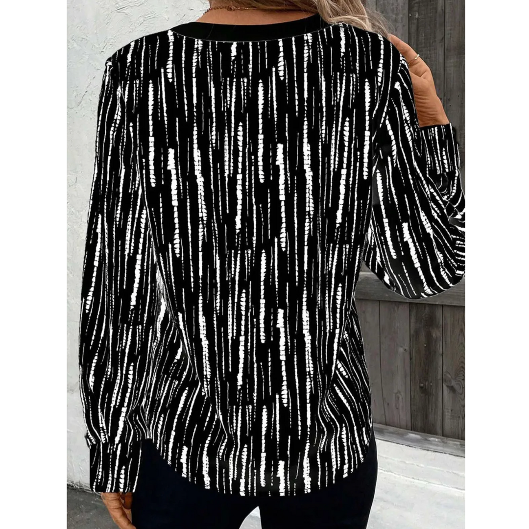 The Midnight Rhythm Top is a chic blend of sophistication and edge. With its bold black base accented by vertical white streaks, it creates a striking silhouette that elongates the body while adding a modern artistic flair. The sleek split neckline and relaxed fit make it effortlessly versatile—perfect for dressing up with tailored pants or styling casually with jeans. This piece is designed for the woman who wants to make a confident, contemporary statement.