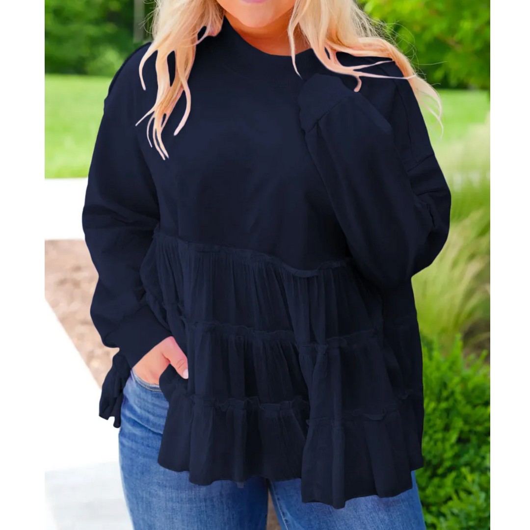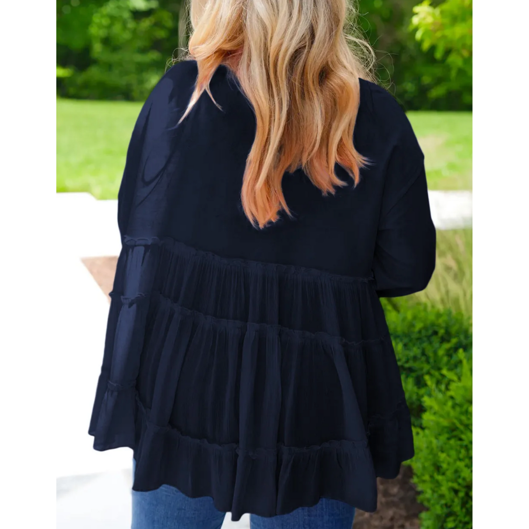 The Midnight Ruffle Bliss Top brings together cozy comfort and feminine flair in one stunning piece. Designed with a relaxed fit and flowy tiered ruffle hem, this top drapes beautifully while giving you effortless style. Perfect for pairing with jeans, leggings, or skirts, it’s a versatile must-have that transitions seamlessly from casual daytime wear to a chic evening look.