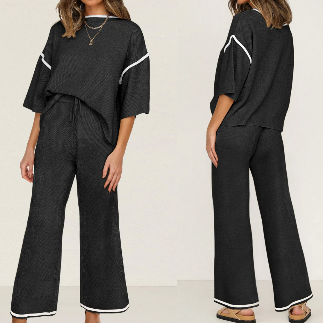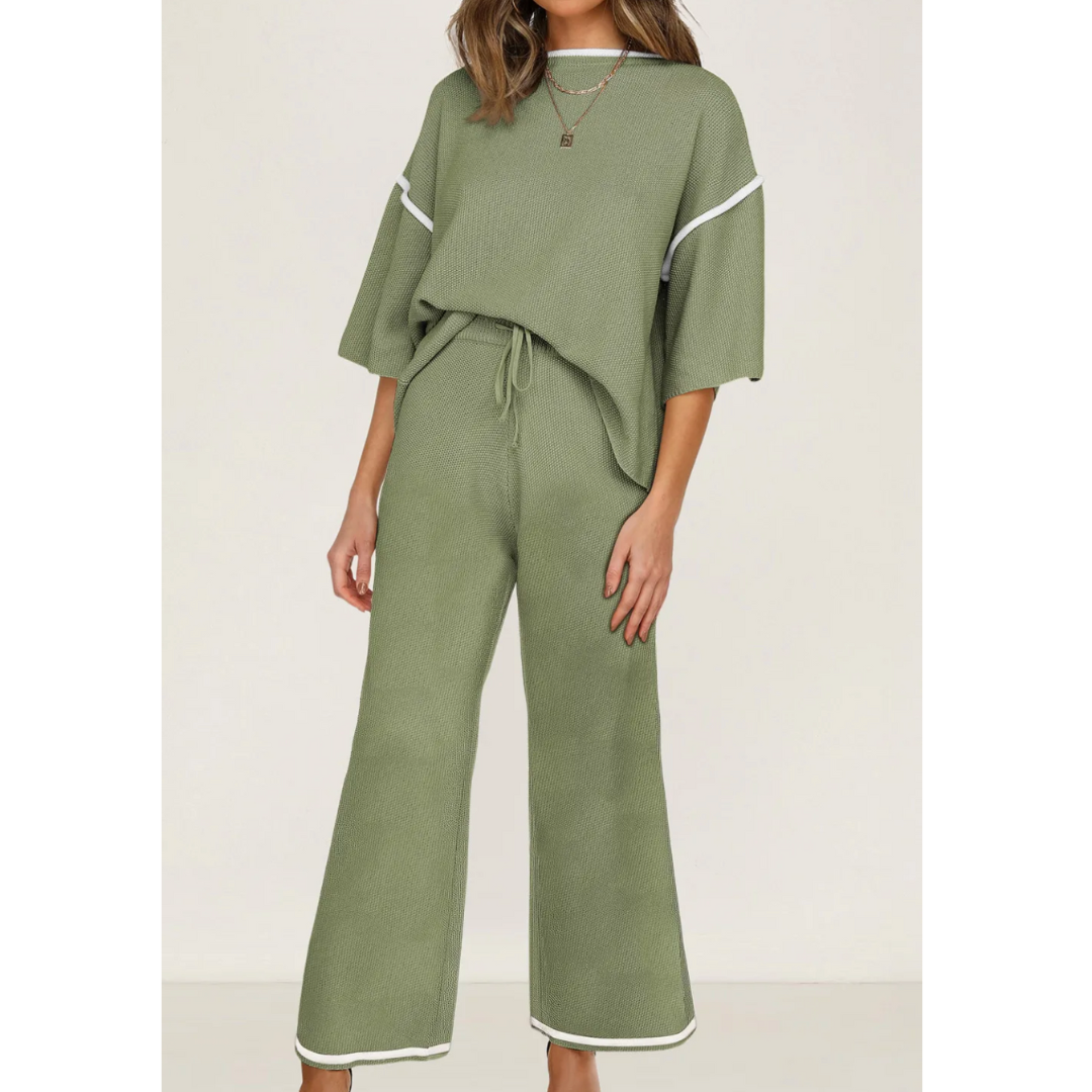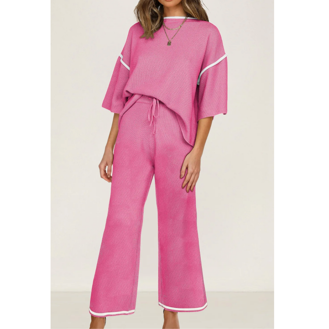 Elevate your everyday with the effortlessly sleek Oh So Classy Set. This two-piece outfit features a relaxed drop-shoulder top with contrast piping and wide-leg crop pants that blend polish with pure comfort. The soft, breathable fabric and flowy silhouette make it your go-to for casual brunches, travel days, or chic lounging. It's the perfect blend of comfy and sophisticated — because style shouldn't have to try too hard. eta 2 weeks