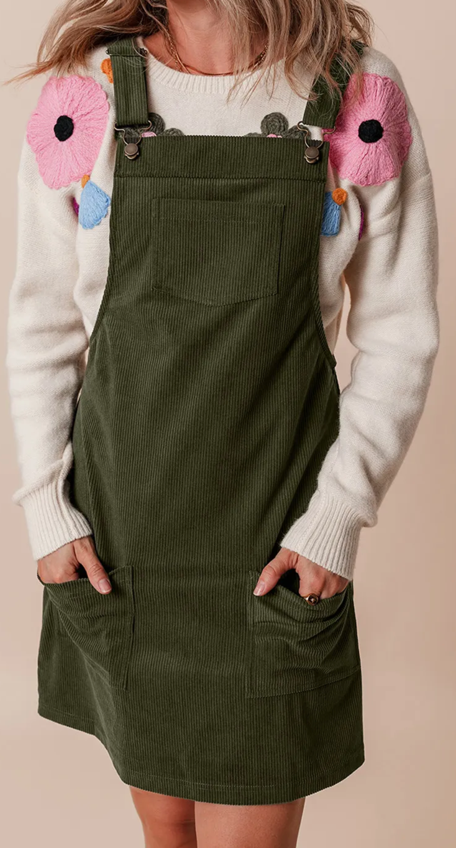 Fall in love with the cozy charm of the Olive You Forever Corduroy Overall Dress. Crafted from soft, fine-ribbed corduroy in a rich olive hue, this dress brings vintage vibes with a modern twist. Featuring adjustable straps with metal clasp hardware, a front chest pocket, and two roomy front pockets for all your essentials, this dress is as functional as it is fashionable. The mini length makes it perfect for layering over chunky sweaters, graphic tees, or long sleeves for that effortless seasonal style.