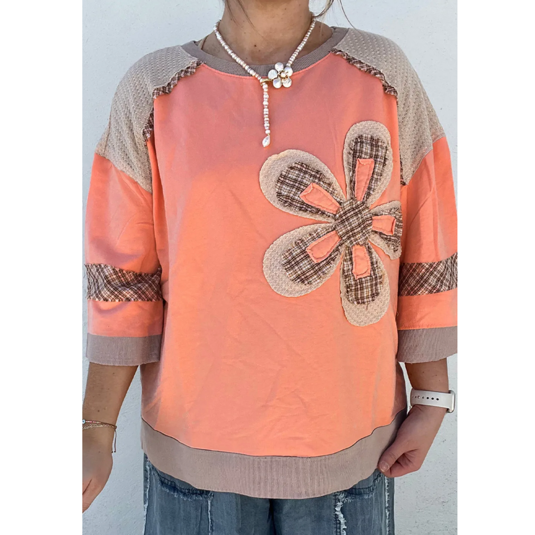 Step into comfort and charm with our Peach Blossom Patchwork Top. This relaxed-fit, three-quarter sleeve top blends a playful peach hue with earthy patchwork accents. Featuring a large appliqué daisy in textured and plaid fabrics, waffle-knit shoulder panels, and coordinating plaid sleeve details, this piece balances whimsical style with cozy wearability. The soft ribbed neckline, cuffs, and hem add a snug, casual finish, perfect for pairing with your favorite jeans or lounge pants.
