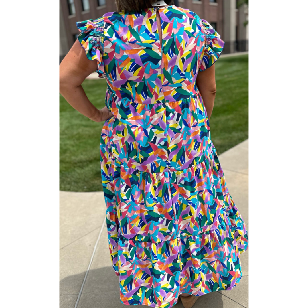 Unleash your inner fashionista with the Picture Perfect Abstract Print Maxi Dress (1X-4X). This dress boasts a flattering silhouette and versatile styling, making it a must-have addition to your wardrobe. Crafted from comfortable fabric, the dress features charming short ruffle sleeves, a chic neckline, and elegant tier ruffles, embodying a trendy babydoll style. Elevate your look with this stunning dress that combines comfort and style effortlessly! eta 2 weeks