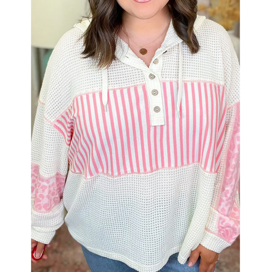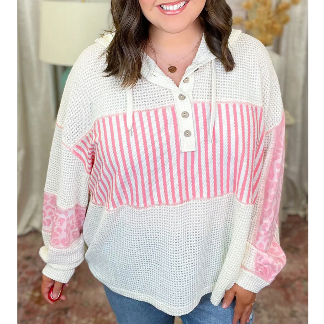 The Pink Meadow Hoodie Top blends cozy texture with playful charm. Crafted in a soft waffle-knit fabric, this top features a button-up henley neckline, drawstring hood, and a relaxed fit for all-day comfort. Bold pink-and-white stripes across the chest meet blush leopard-print sleeve panels for a fun mix of patterns that add personality to your casual look. Pair it with jeans or leggings for a laid-back yet stylish vibe.