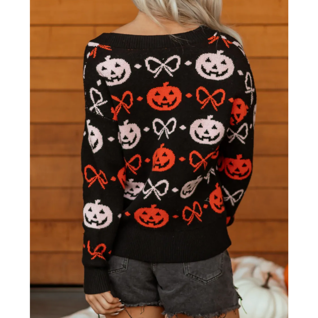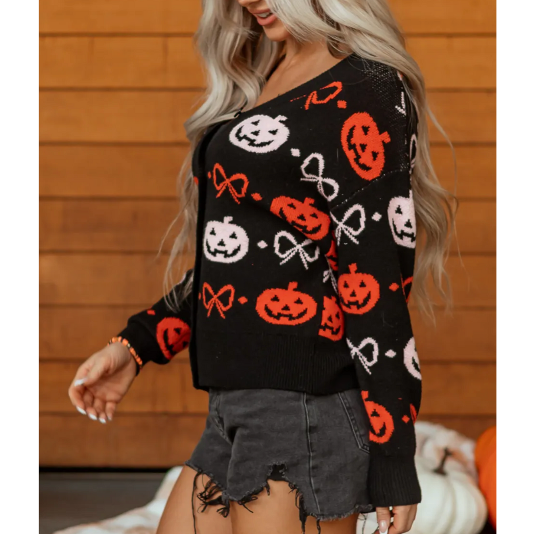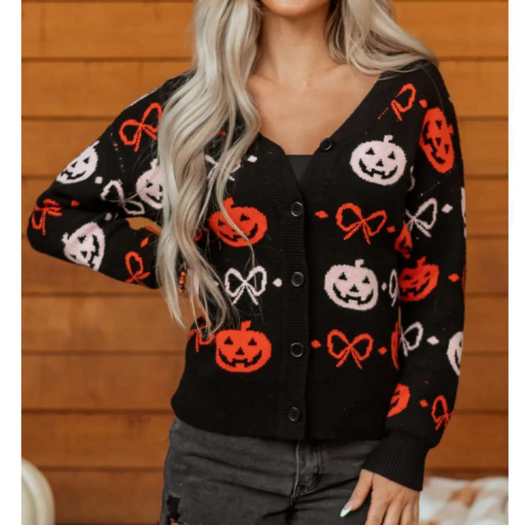 Bring spooky season vibes to your everyday style with the Pumpkin Patch Charm Cardigan. This cozy black knit features playful jack-o’-lanterns in bold orange and soft white, paired with whimsical bow accents for a festive, feminine twist. Designed with a button-front closure and relaxed fit, it’s the perfect piece to layer over tees or tanks for pumpkin carving nights, haunted hayrides, or casual fall outings. Whether you’re sipping cider or handing out candy, this cardigan wraps you in Halloween spirit while keeping you stylishly comfortable.
