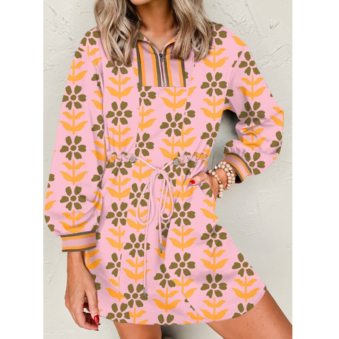 Step into bold retro vibes with the Retro Bloom Drawstring Dress. Featuring a playful pink base with vibrant orange stems and earthy olive floral patterns, this dress is a statement piece with a touch of vintage flair. The half-zip striped neckline and striped cuff detail give it a sporty-chic edge, while the drawstring waist cinches for a flattering silhouette. Perfect for brunch, casual outings, or adding a pop of personality to your everyday style.