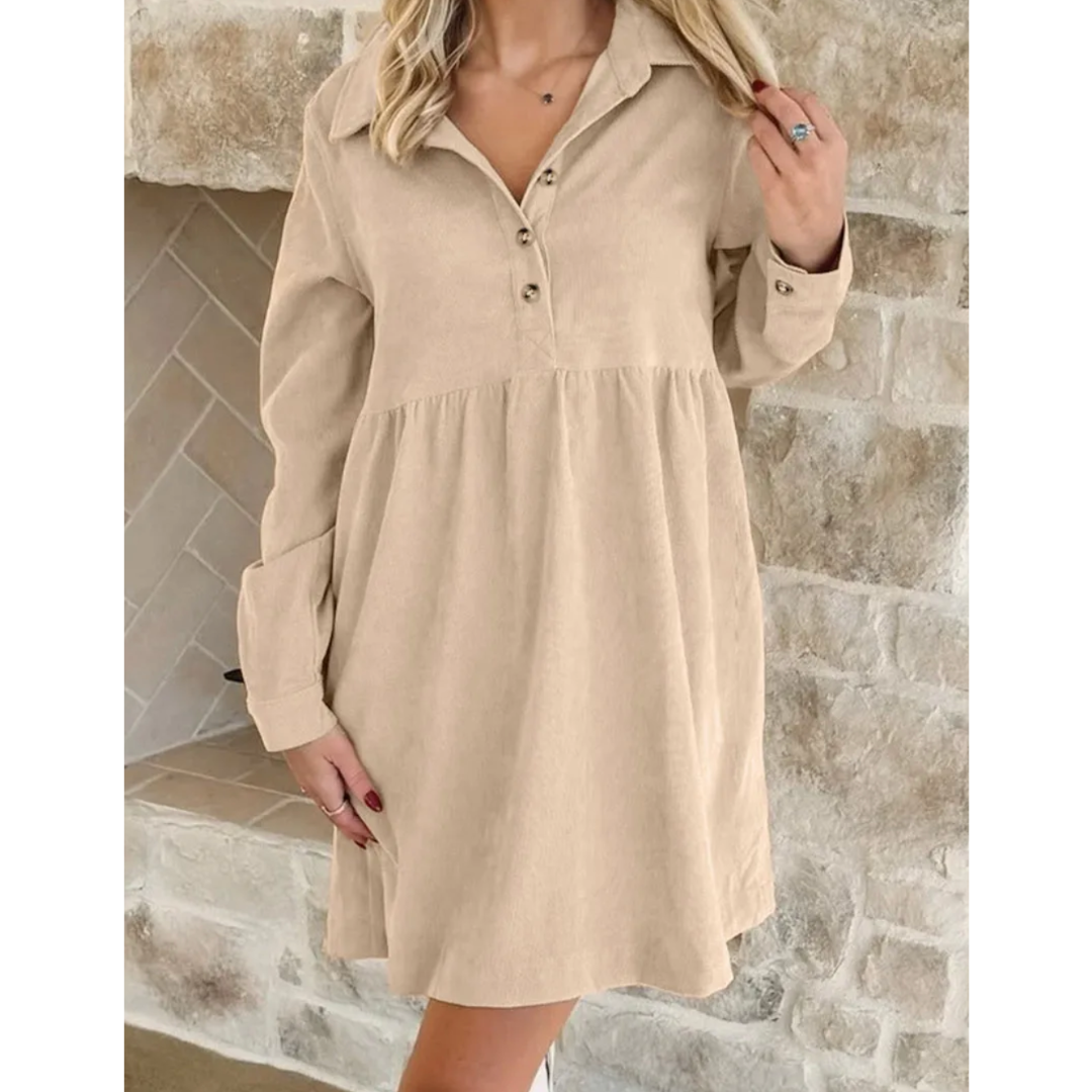 The Sandstone Charm Corduroy Dress is the perfect blend of comfort and understated elegance. Crafted from soft, lightweight corduroy, this dress features a relaxed fit with a collared neckline and a partial button-front placket for a polished yet effortless vibe. The empire waistline adds a touch of femininity while ensuring a flattering silhouette. Long sleeves with button cuffs make it versatile for cooler days, and the neutral beige hue allows for endless styling possibilities—pair it with boots for a cozy chic look or dress it up with accessories for a casual outing.