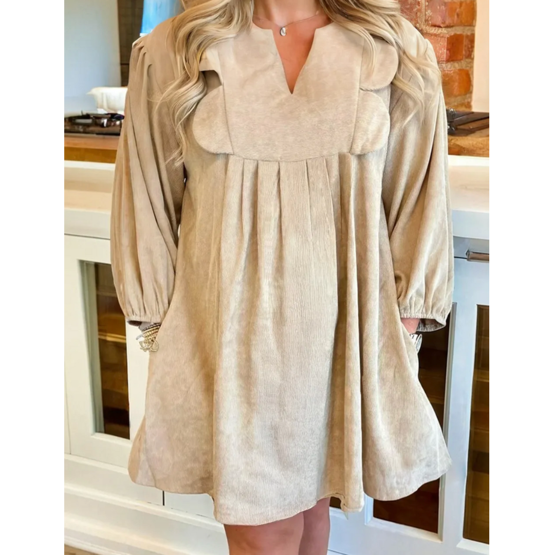 The Sandstone Grace Dress is where comfort meets timeless charm. Crafted in a soft, neutral beige hue, this plus-size dress features a flowy A-line silhouette that drapes beautifully on every figure. The statement scalloped yoke detail adds a touch of sophistication, while the gathered pleats create graceful movement with every step. Balloon sleeves with elastic cuffs give it a chic finish—perfect for brunch, casual outings, or cozy evenings.