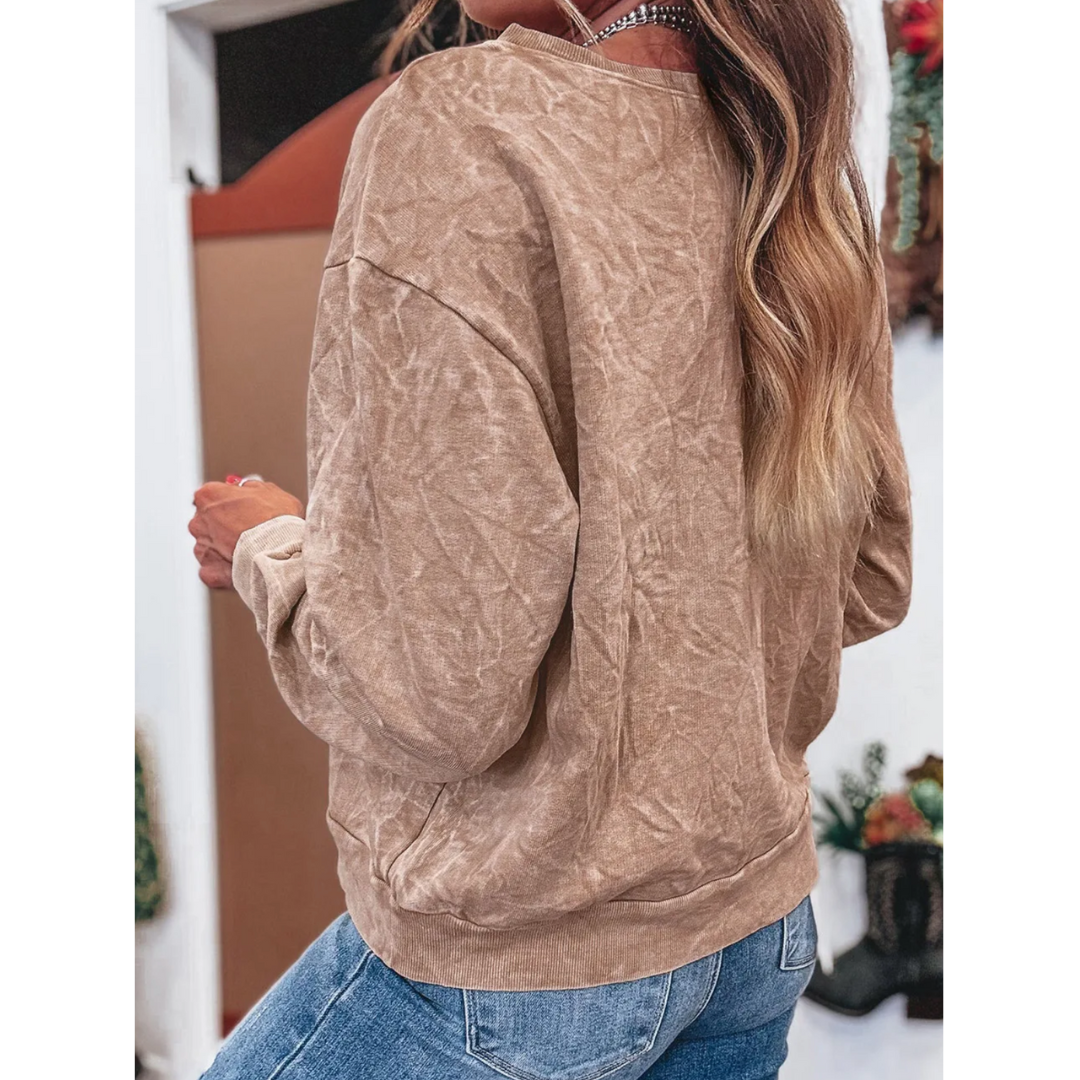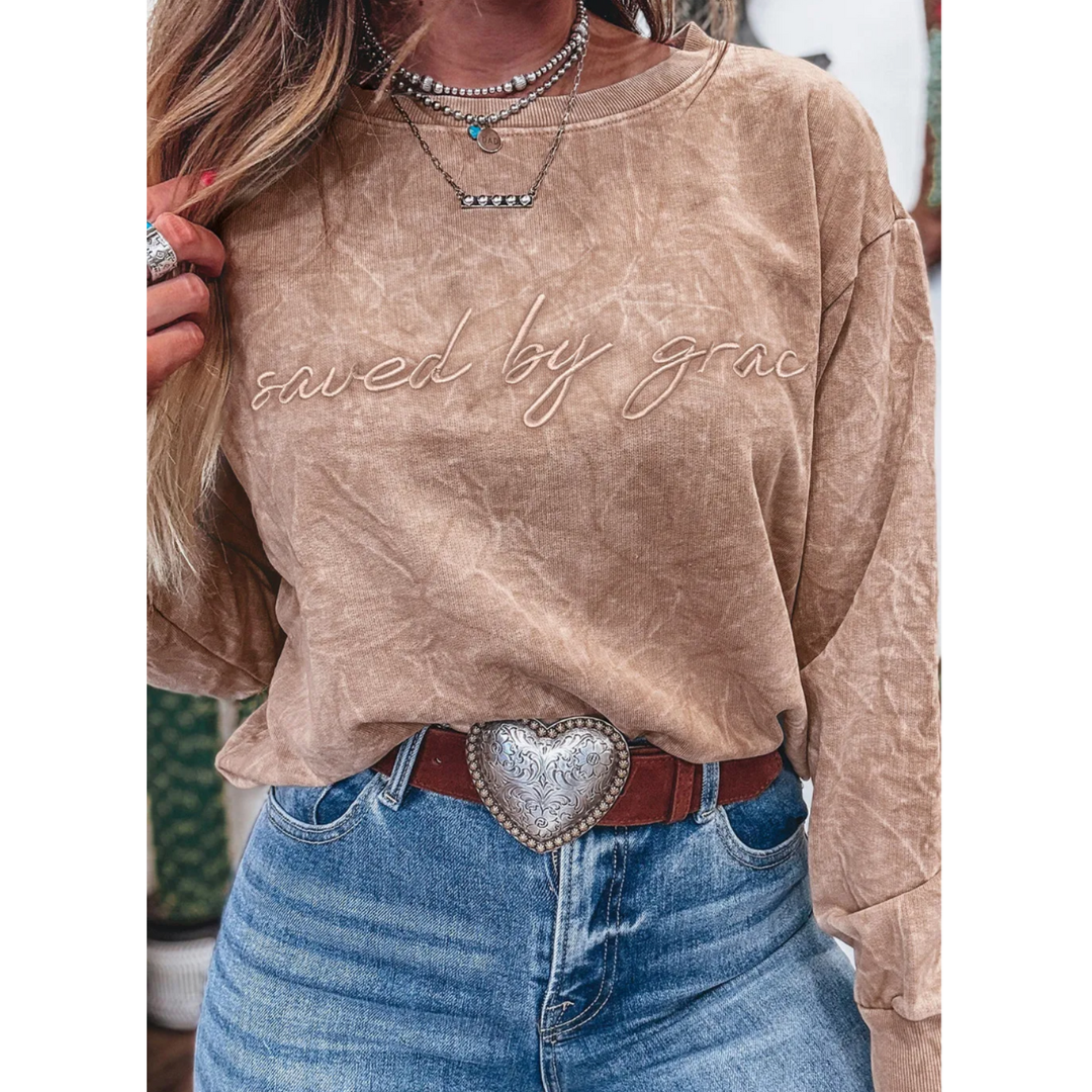 Wrap yourself in effortless style and meaning with our Saved by Grace Mineral Wash Sweatshirt. Featuring a beautifully soft beige mineral-wash finish and subtle embroidered script across the chest, this piece blends faith and fashion seamlessly. The relaxed fit, ribbed cuffs, and lightweight comfort make it the perfect year-round layering piece. Dress it up with denim and boots or keep it casual with leggings and sneakers—the message speaks volumes no matter how you wear it.