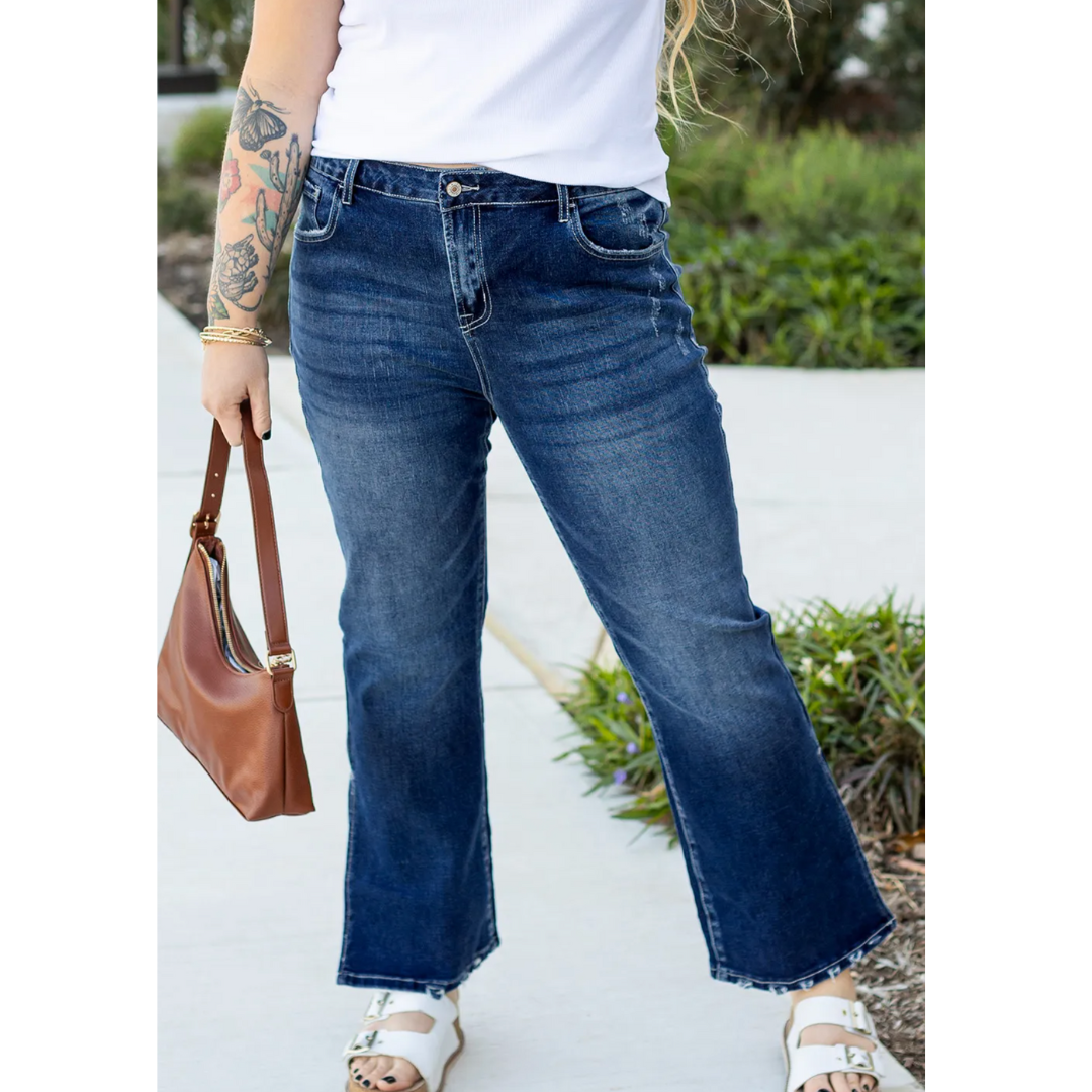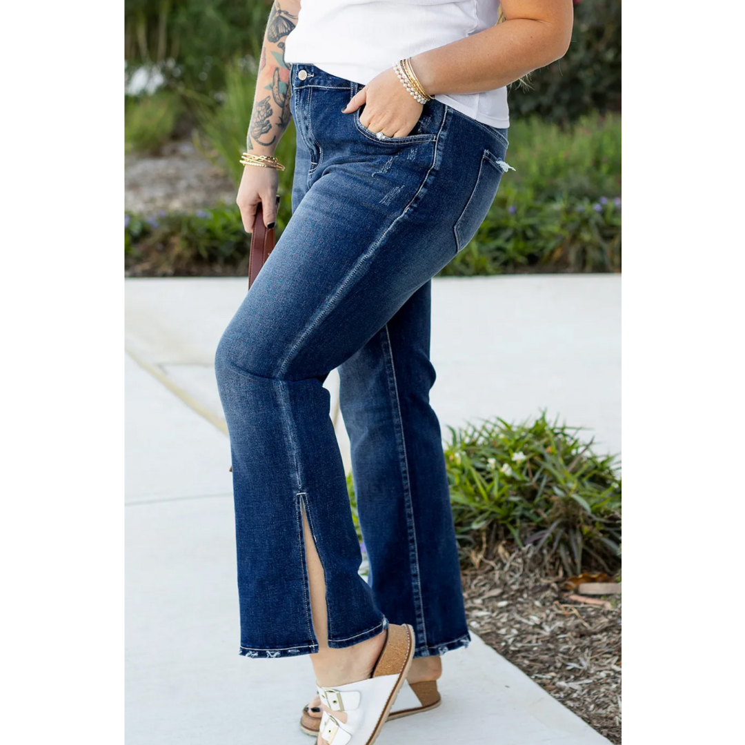 Step into casual chic with the Side Street Slit Hem Jeans — a fresh twist on a classic denim silhouette. Crafted in a rich dark wash with subtle fading, these jeans feature a straight-leg cut that flatters every figure. The unique ankle slit detail adds a playful edge while offering extra comfort and movement. Light distressing on the back pockets brings a laid-back vibe, and the mid-rise fit keeps them versatile for everyday wear. Pair them with sandals for a weekend stroll or dress them up with heels for a night out.