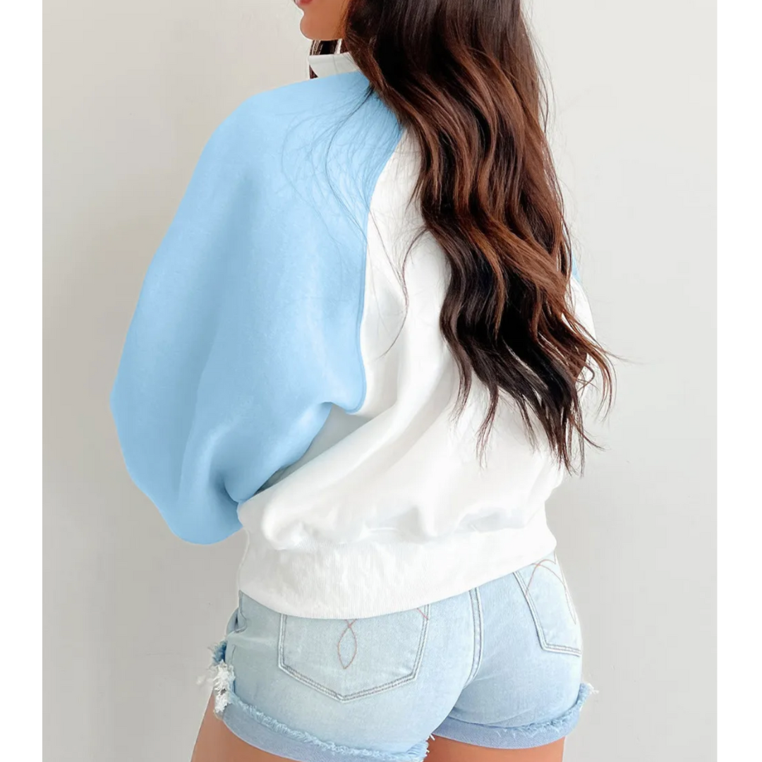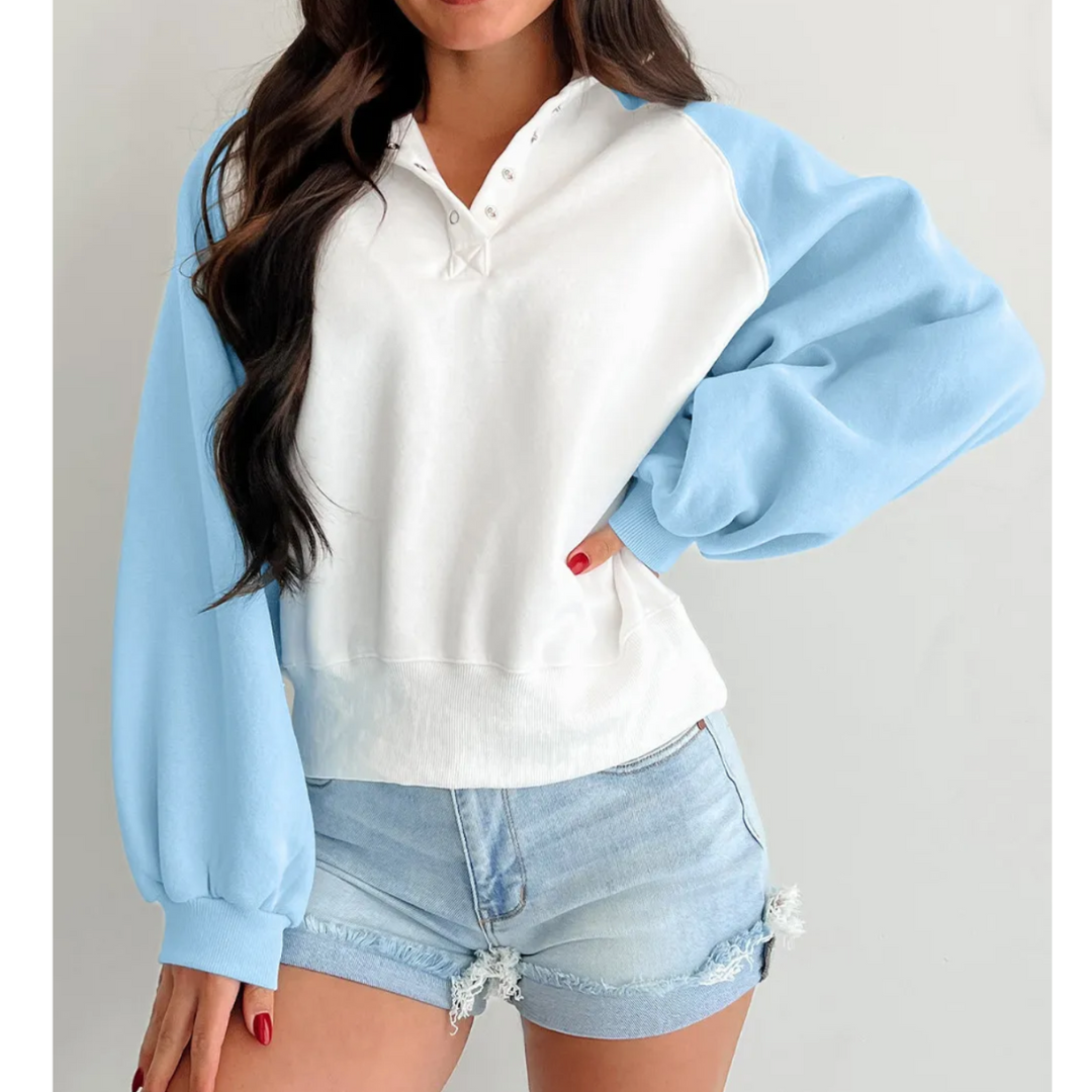 The Skyline Breeze Sweatshirt brings effortless cool with its crisp white body and soft baby-blue raglan sleeves. Designed for casual days and cozy vibes, this pullover features a snap-button V-neckline, relaxed fit, and lightweight fleece texture that’s perfect for layering or wearing solo. Pair it with denim shorts for a laid-back look or joggers for lounge-ready style. Comfort never looked this chic.