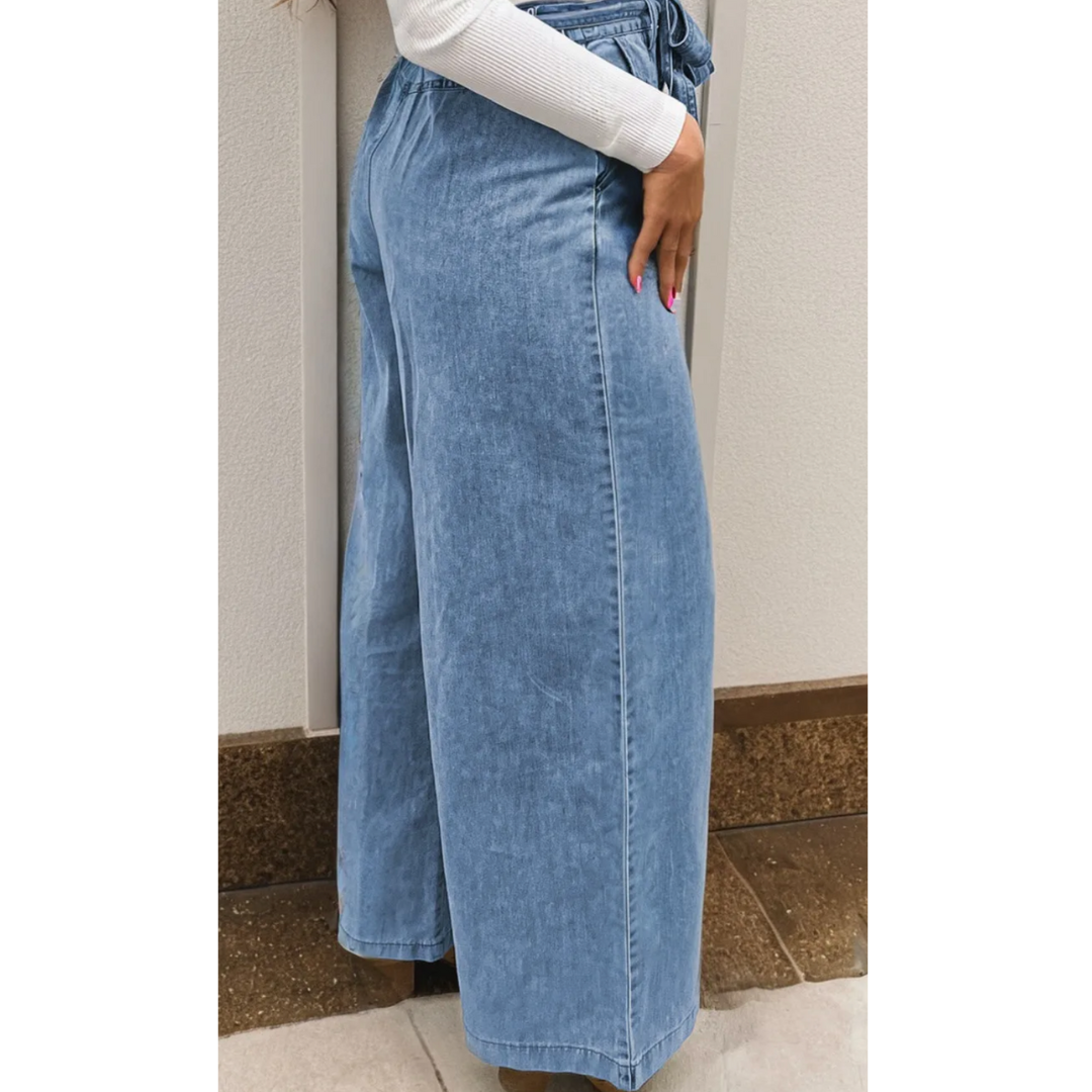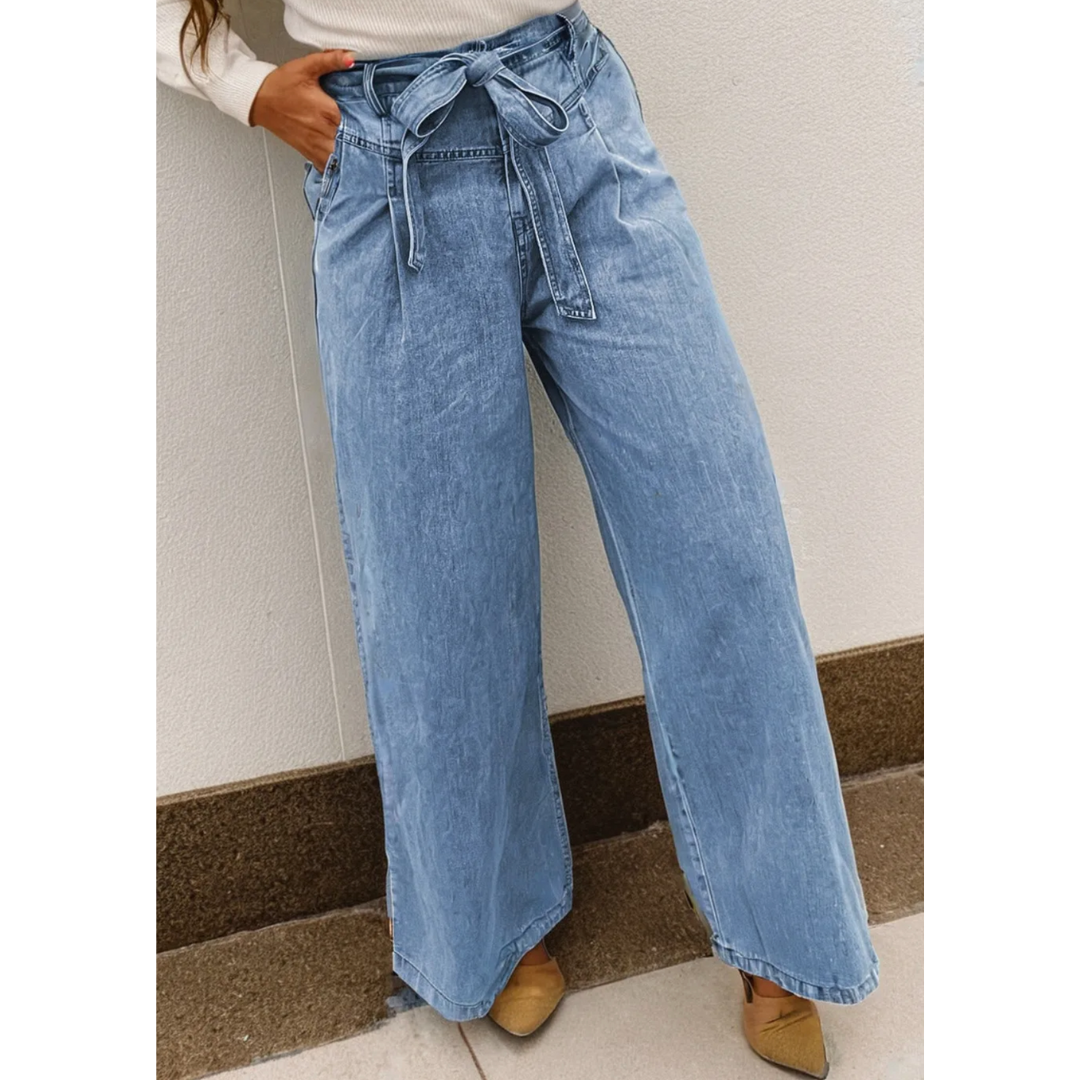 Step into effortless style with the Skyline Tie-Waist Jeans. Designed with a relaxed wide-leg silhouette, these jeans bring a chic yet casual vibe to your everyday wardrobe. The light wash denim offers a timeless, versatile look, while the tie-waist belt adds a flattering, feminine touch. Perfect for pairing with fitted tops or cozy knits, these jeans are as comfortable as they are stylish.