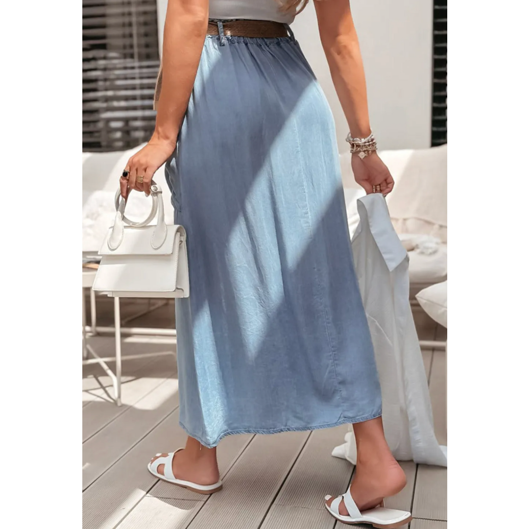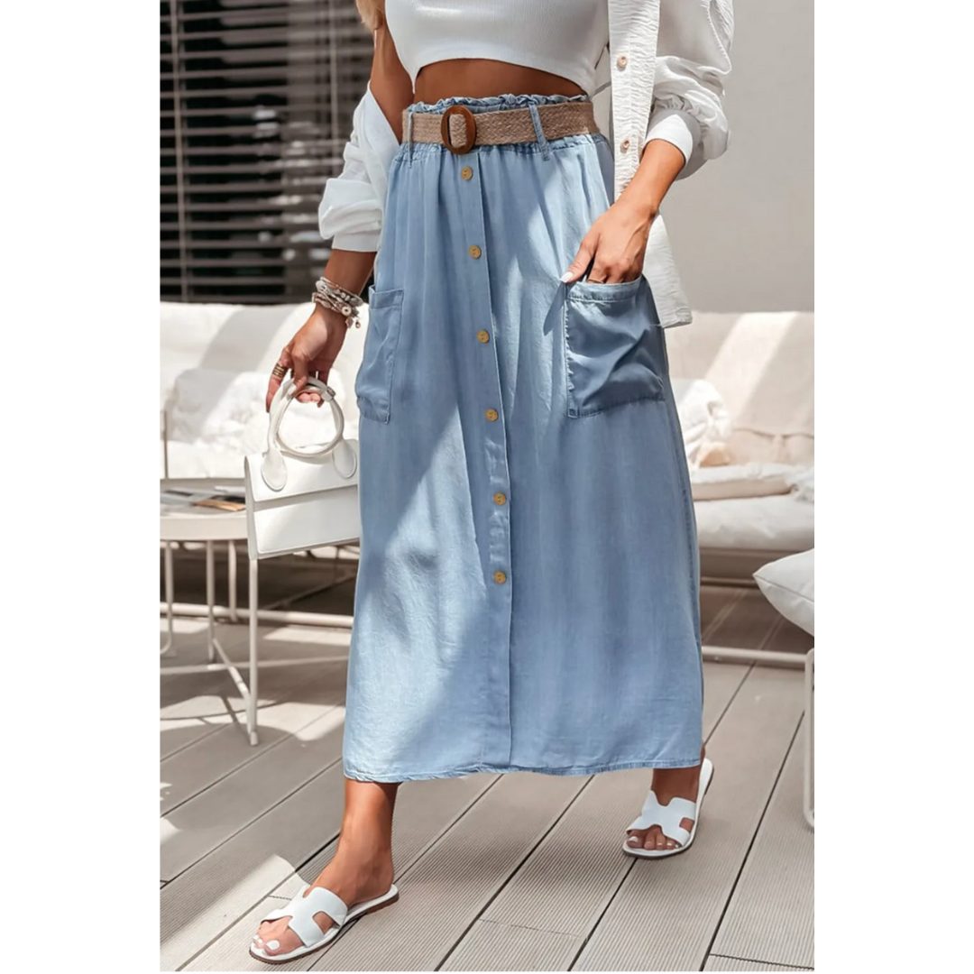 Slip into a dreamy, carefree vibe with our Strolling Through Blue Skies midi skirt! This lightweight chambray piece is a closet essential for sunny strolls, café dates, and weekend escapes. Designed with an elastic waistband for a comfy, flexible fit and finished with a woven belt for a touch of natural charm. The button-front detail and side patch pocket bring casual character, while the breezy fabric keeps you cool and effortlessly chic.