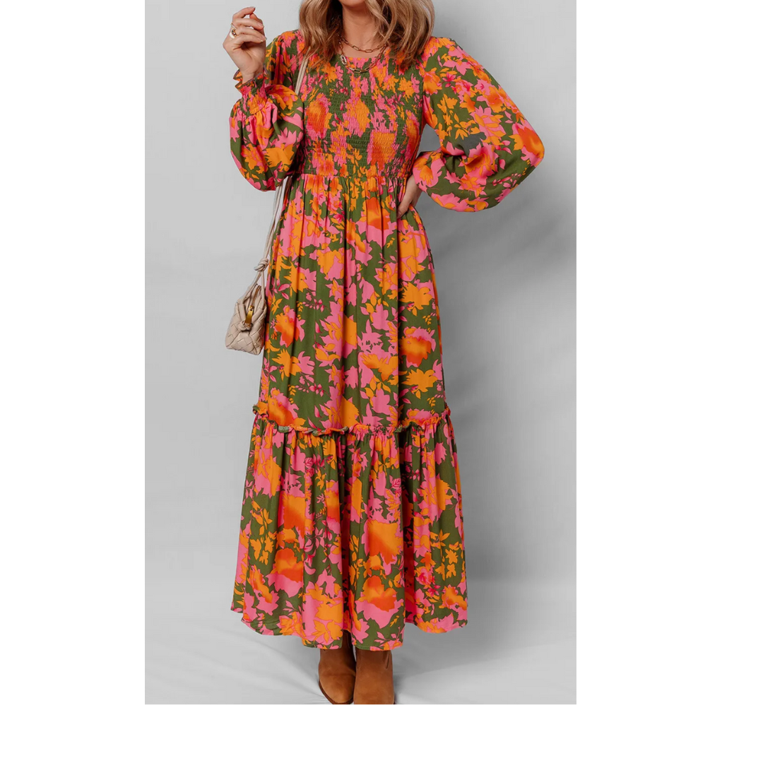 Radiating bold, carefree energy, the Sunset Bloom Maxi Dress is your go-to statement piece for brunches, vacations, or any day you want to glow with confidence. The vibrant mix of fuchsia pink, fiery orange, and earthy green florals creates a striking palette that feels both retro and modern. Its flowing silhouette and smocked bodice make it flattering yet effortless, while the tiered skirt adds graceful movement with every step.