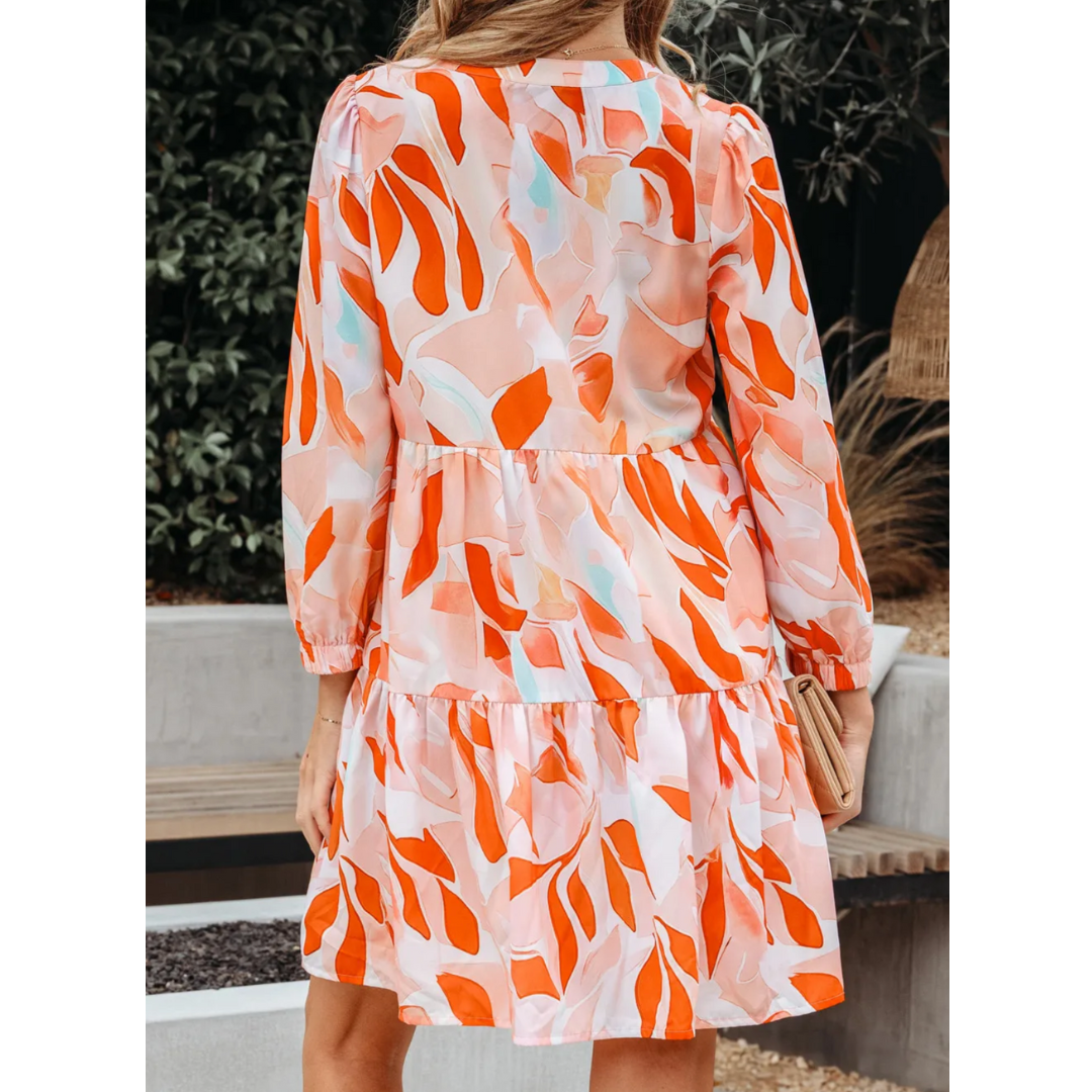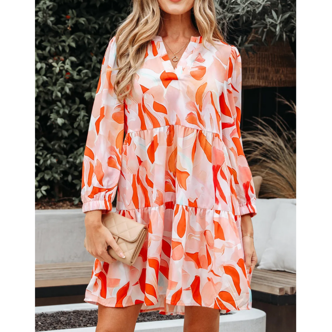 Bring effortless charm to your wardrobe with the Sunset Petals Dress—a breezy, tiered mini that radiates confidence and style. Featuring a playful watercolor-inspired print in vibrant shades of coral, peach, and soft pastels, this dress captures the essence of sunshine and movement. Its flowy silhouette and lightweight fabric make it perfect for both casual outings and dressed-up moments. With long sleeves, a flattering v-neckline, and a relaxed fit, it’s the ideal mix of comfort and sophistication.